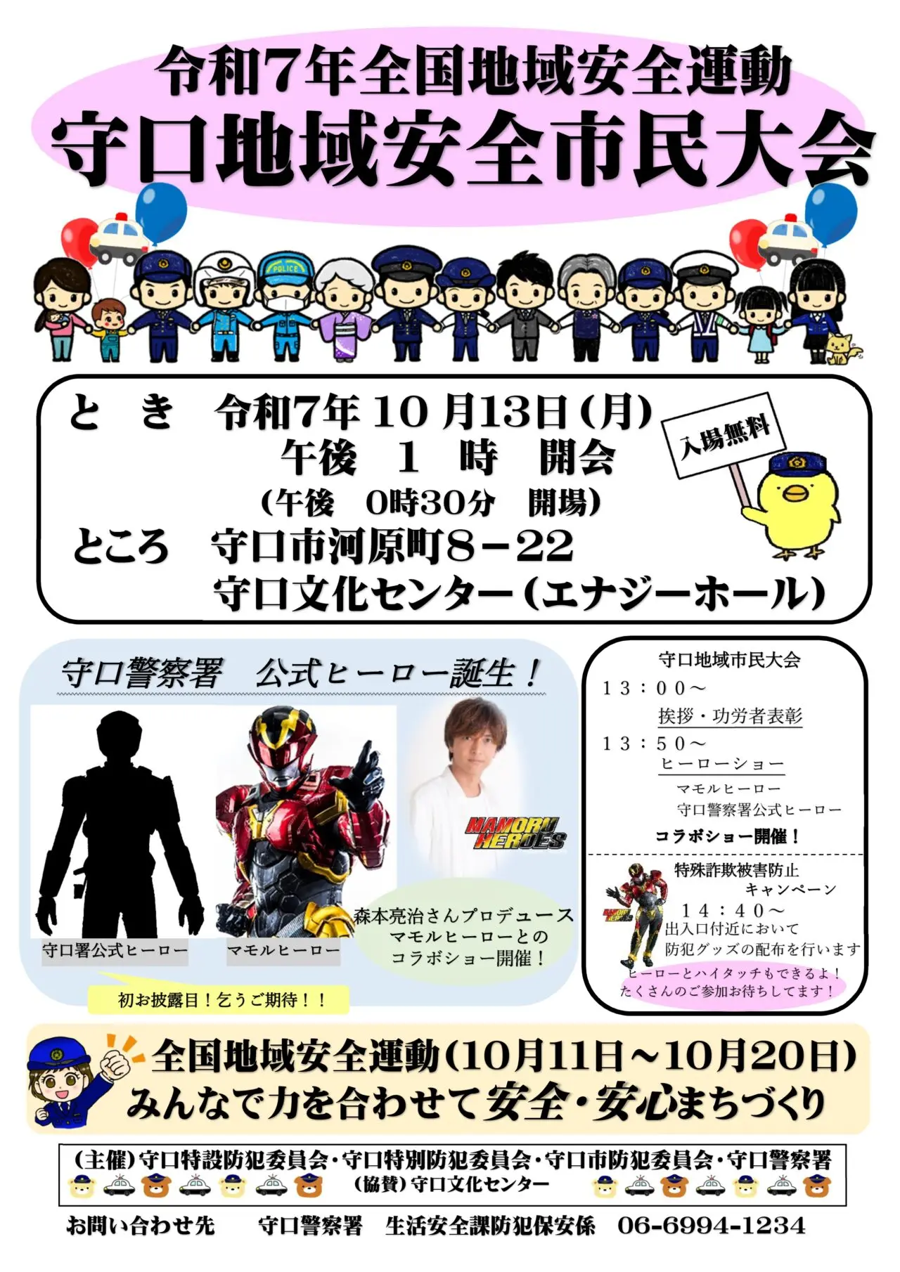 【守口市】エナジーホールで「守口地域安全市民大会」が10月13日に開催されます。新ヒーローのお披露目や「マモルヒーロー」、「たこべえ」も登場します。