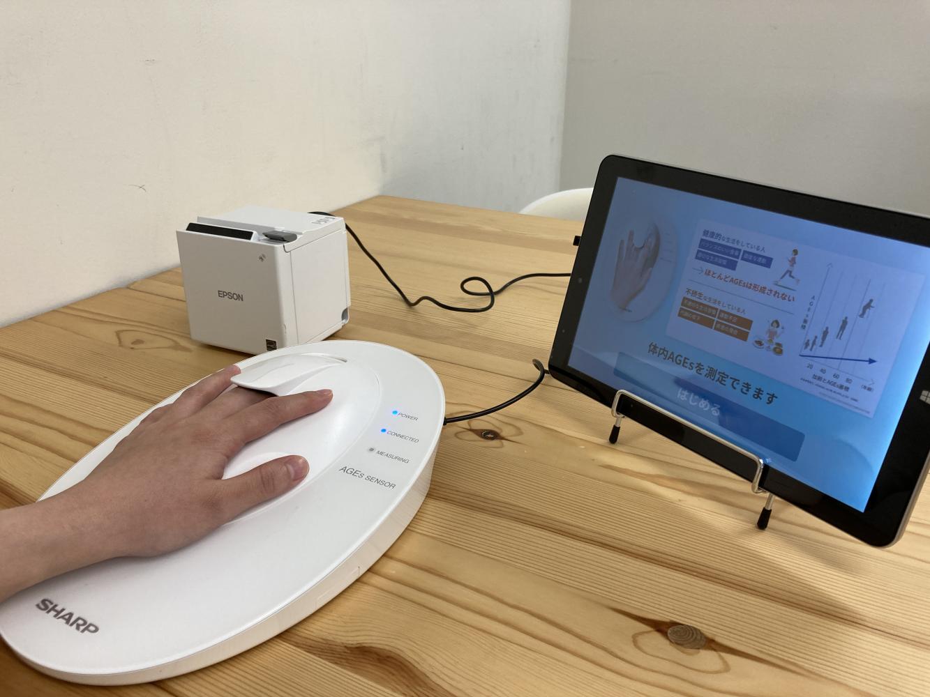 当日の、無料測定会では、写真のような「AGEs センサー」を使っての測定になります。血液の採取は、不要のため、心理的負担も少なく、老若男女問わず簡単に測定が可能です。AGEs センサーの測定結果により、測定した方の同世代の年齢と比較した現在の体の状態をわかりやすくご確認いただけます。