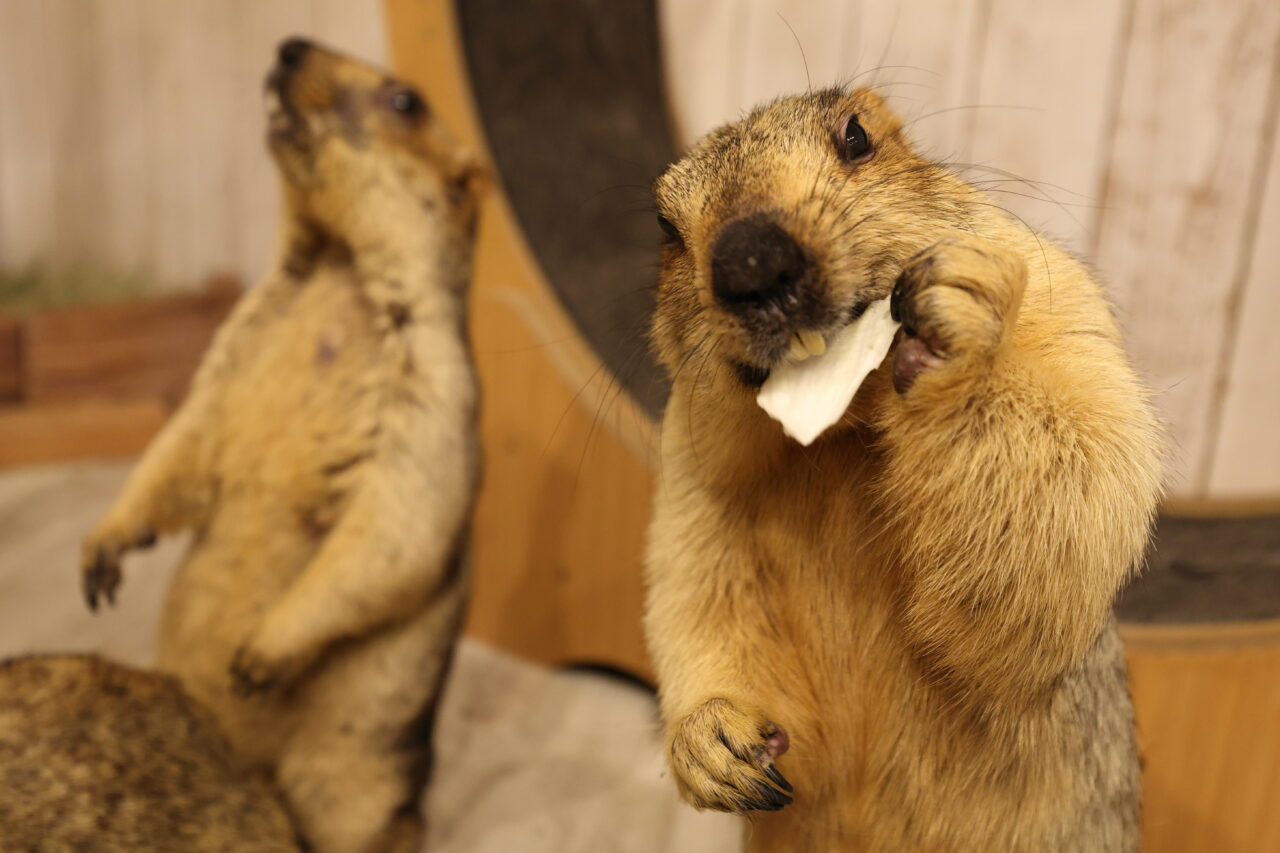 マーモットの体調が第一のため、直接的なふれあいは行っていませんが、おやつあげ体験を通して、マーモットと安心して触れ合える機会を提供。もぐもぐと食べる愛らしい姿を間近で見られます。