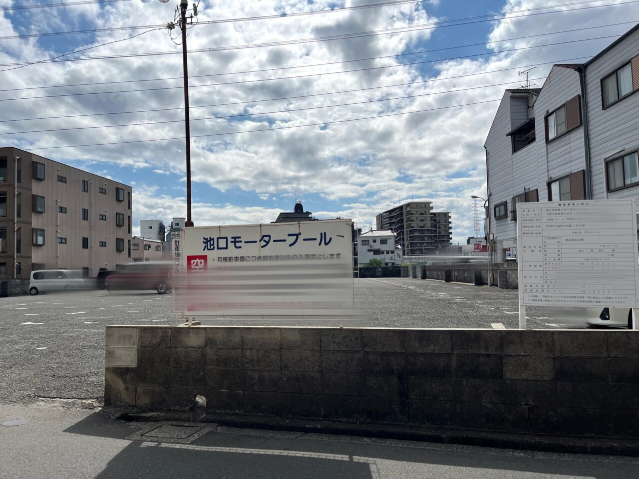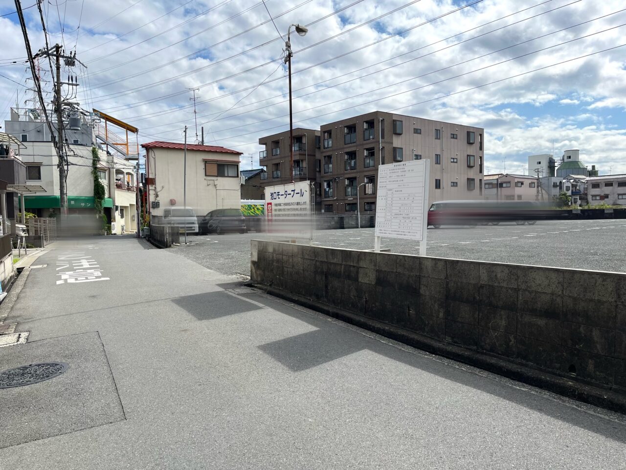 場所はドラッグアカカベ門真大池町店の北側、ファミリーマート門真大池町店から住宅街へ入ったところにある駐車場です。