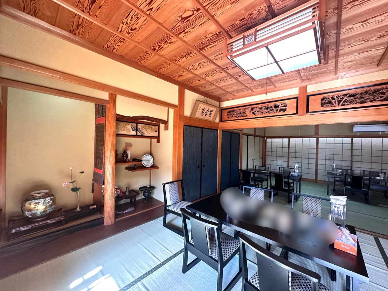 店内の大広間にはテーブルが隣との丁度よい距離感をたもち置かれており、多くのお客さんが来られていましたが落ち着きます。彫刻を施した欄間も素敵です。