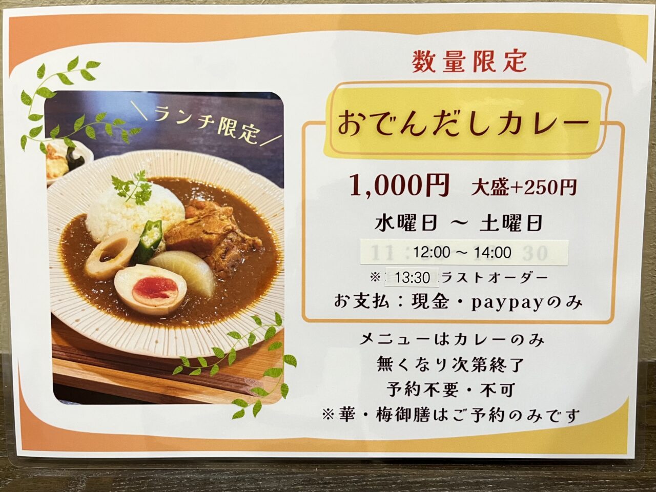 「旬の肴とうまい酒 こたいち」は、夜はおでんや釜めし、一品料理などを提供している和食居酒屋で、お昼は予約制の御膳での営業でしたが、お店の方によると、2025年10月中旬から予約不要のランチメニューとして『おでんだしカレー』の提供を始められたそうです。