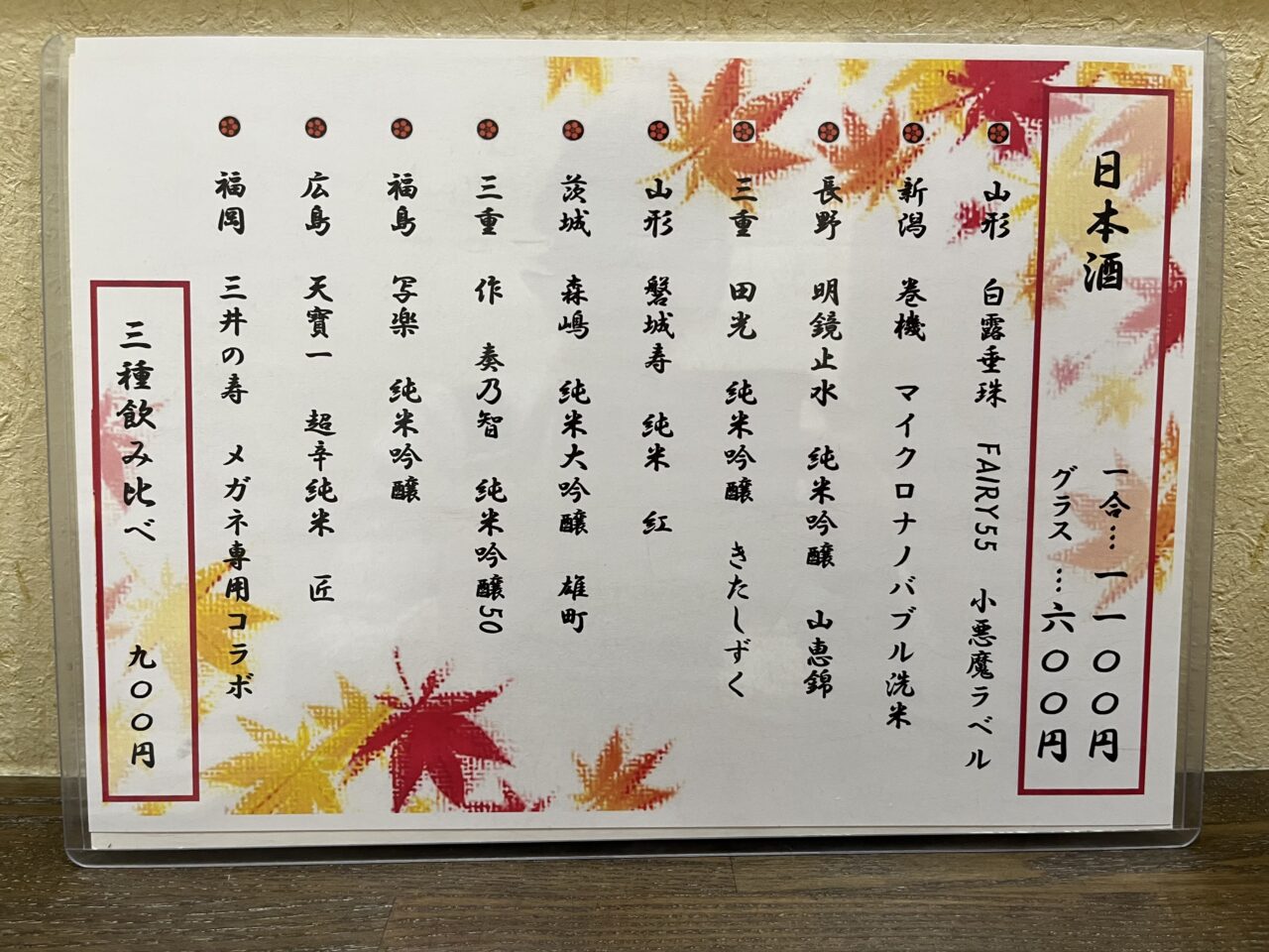 夜の営業では、日本酒もさまざまな銘柄が用意されています。