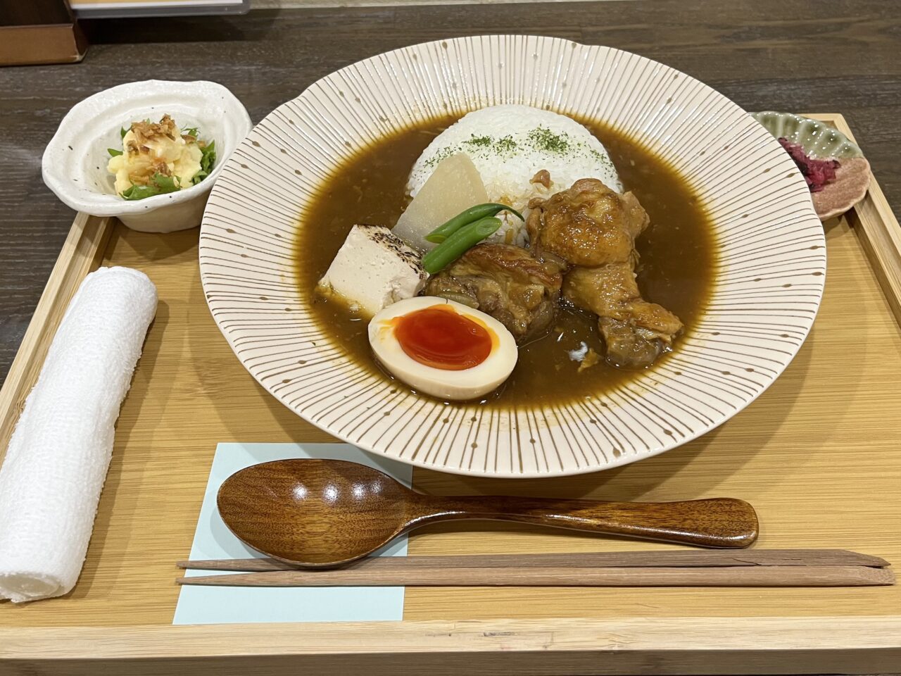 具材にはスペアリブ・手羽元のほか、夜のおでんの具材が使われています。おでんならではの優しい旨味にスパイスが合わさった一皿で、手羽元とスペアリブは箸でほぐれるほどやわらかく、こだわり玉子は黄身がとろりと濃厚です。