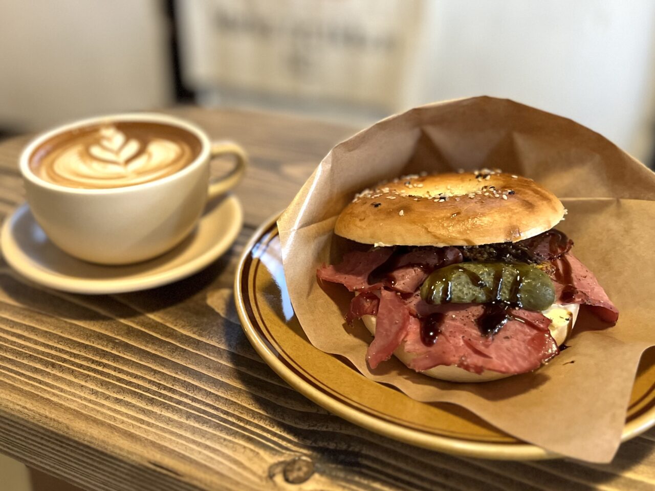 「カフェラテ」と「NYスタイルパストラミビーフ&クリームチーズベーグル」です。