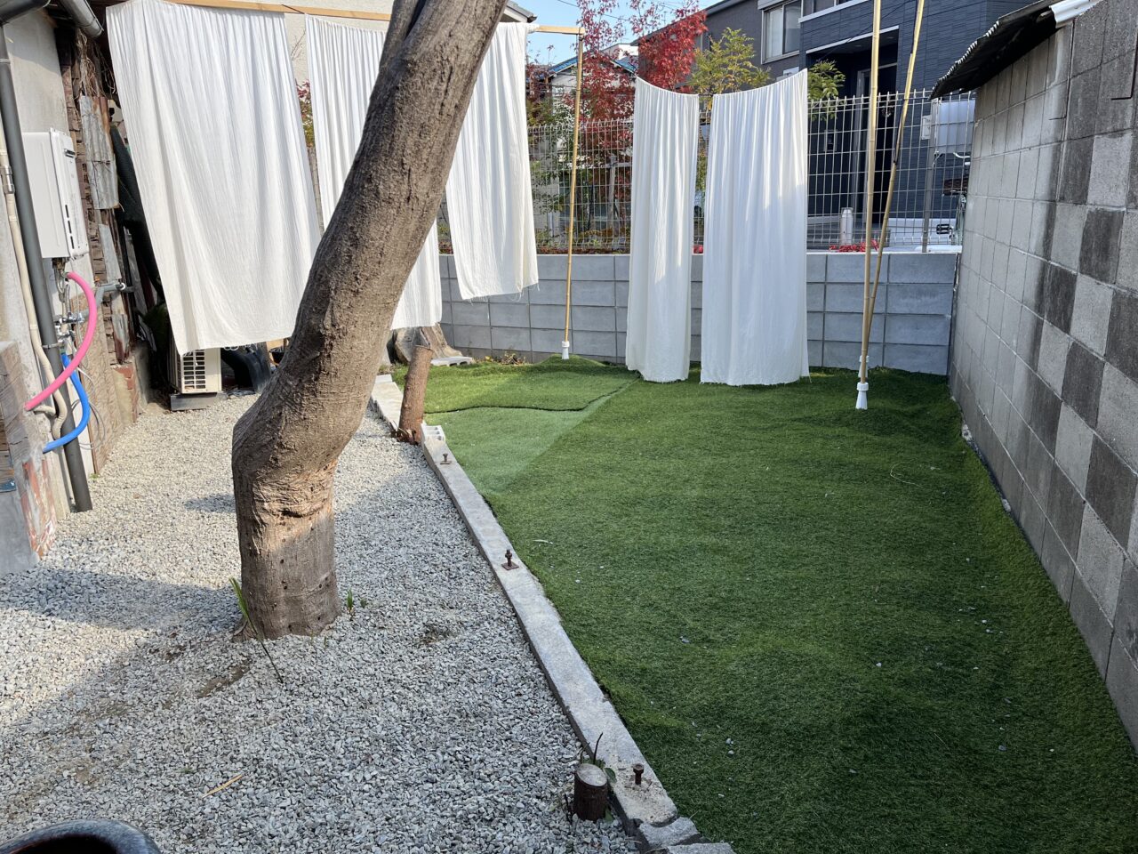 庭には今は何も置かれていませんが、必要に応じてテーブルなどを用意してもらい、外でカフェタイムを楽しむこともできるそうです。ペットと一緒の利用も可能とのことで、過ごしやすい季節には屋外でゆったりと過ごせそうです。