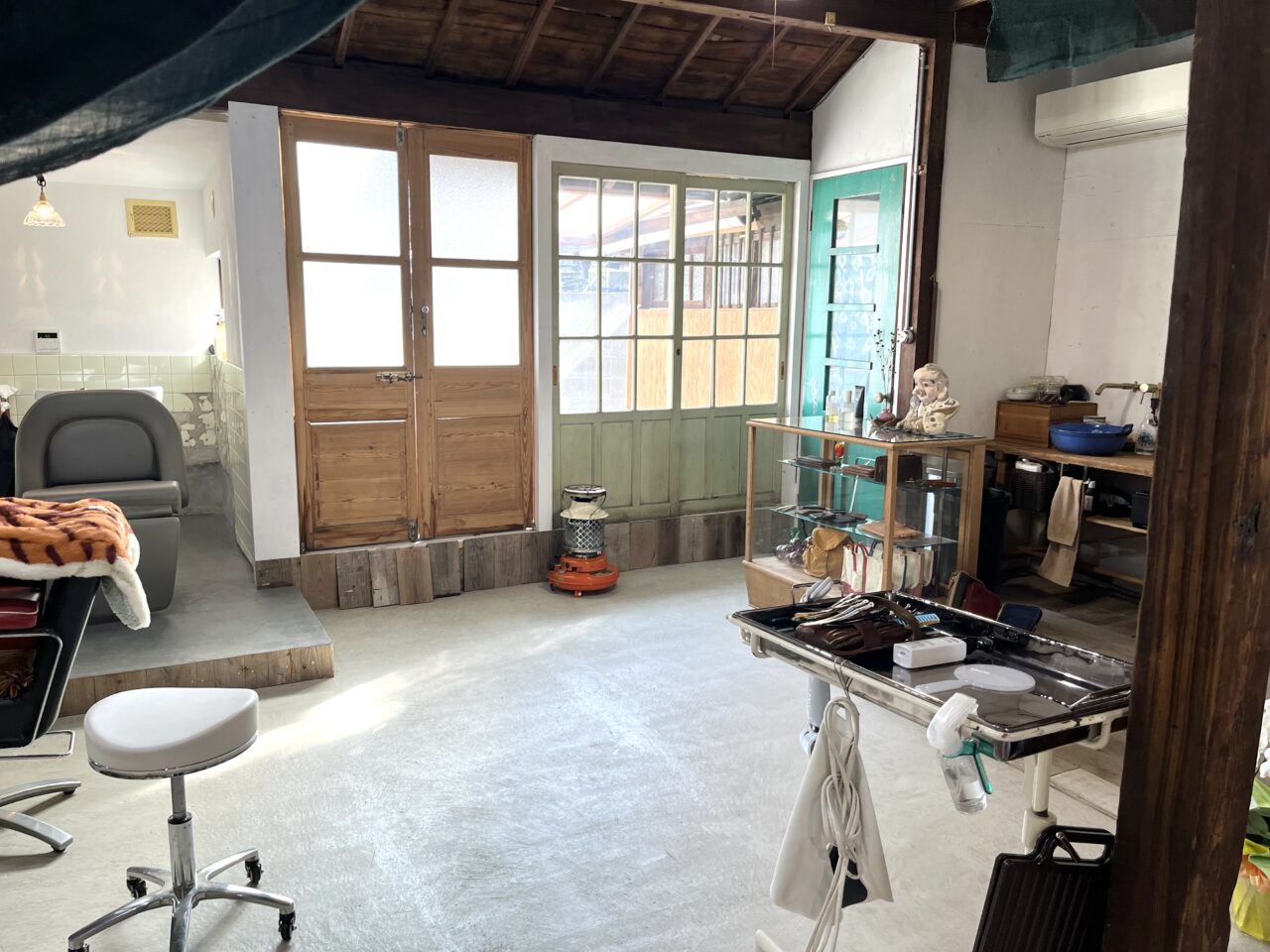 古民家を活かしたお店で、どこか懐かしい雰囲気のなか、落ち着いて過ごせる美容室です。また、奥の扉を開けると庭へ出られます。
