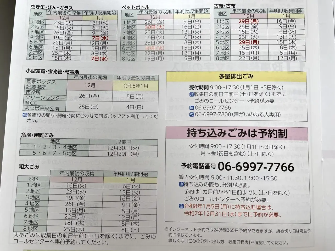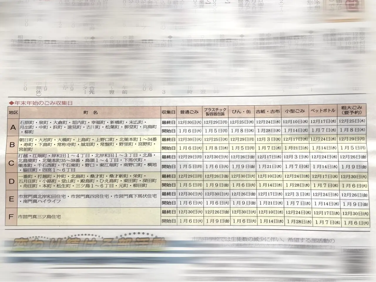 空き瓶・ペットボトル・ビン・ガラス、古紙・古布、粗大ごみなどのゴミについても年内最終の収集曜日が収集地区によって異なります。