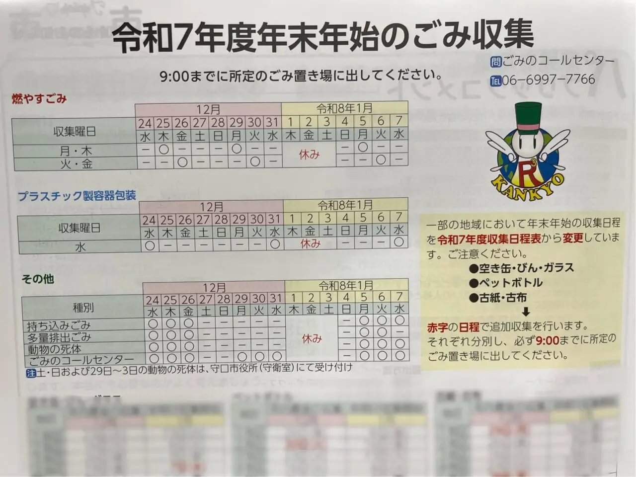 2025年も残りわずかになりました。年末年始は守口市・門真市の地域ごとによってごみ収集のお休みや、収集曜日の変更があります。