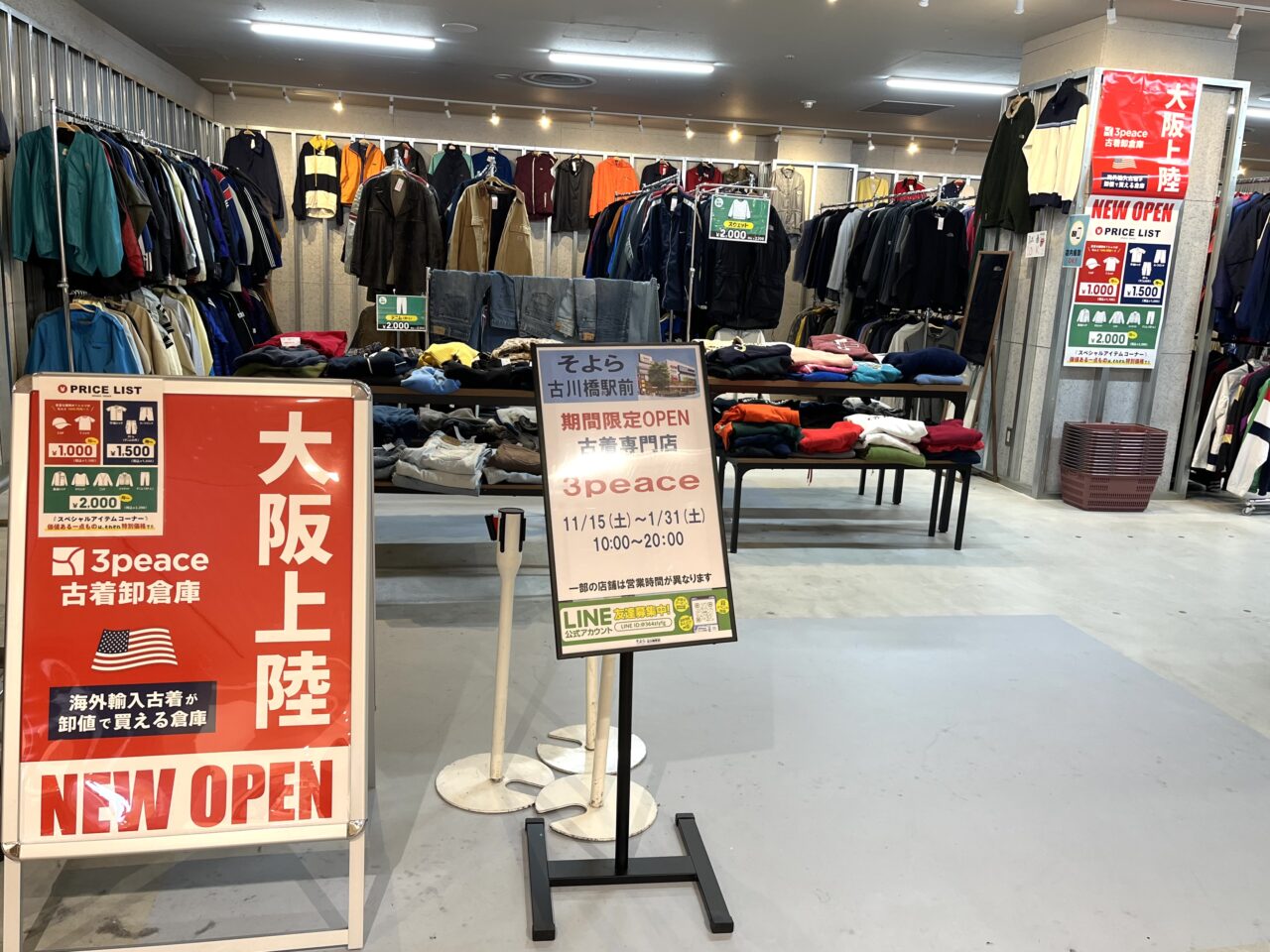 そよら古川橋駅前の2階南側、エレベーター前に、期間限定で古着卸売の店舗「3peace(スリーピース)」がオープンしています。