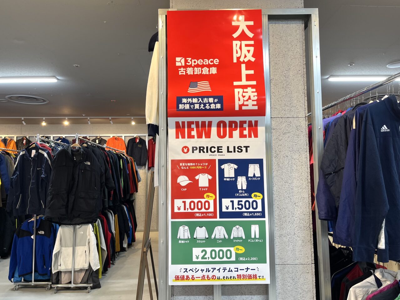 そよら古川橋駅前の2階南側、エレベーター前に、期間限定で古着卸売の店舗「3peace(スリーピース)」がオープンしています。