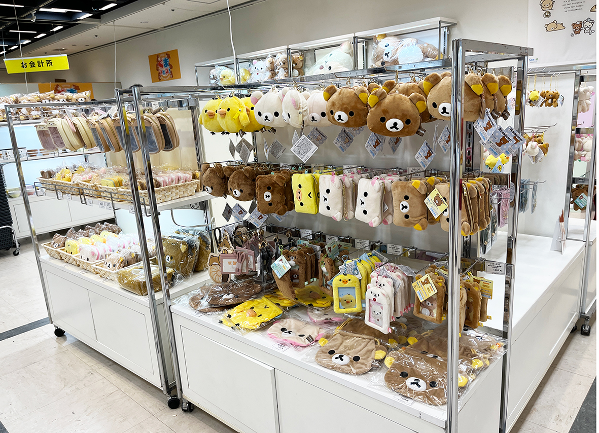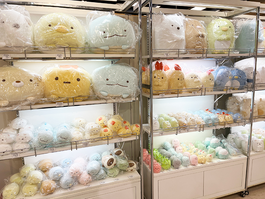 “すみっコぐらし”のコーナーには、ぬいぐるみや雑貨など、やさしい雰囲気のアイテムがずらりと並んでいます。