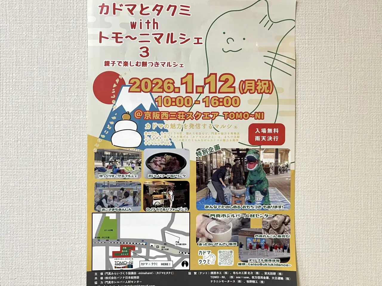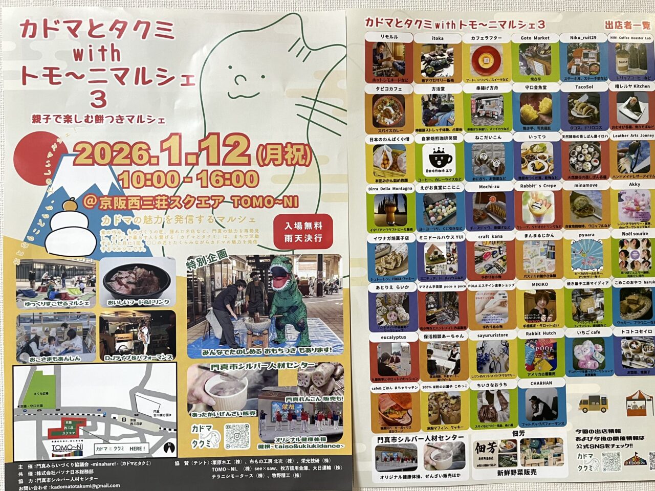 【守口市】餅つき体験も!「カドマとタクミ with トモ〜ニマルシェ3」が1月12日に京阪西三荘スクエアTOMO〜NIで開催されます。