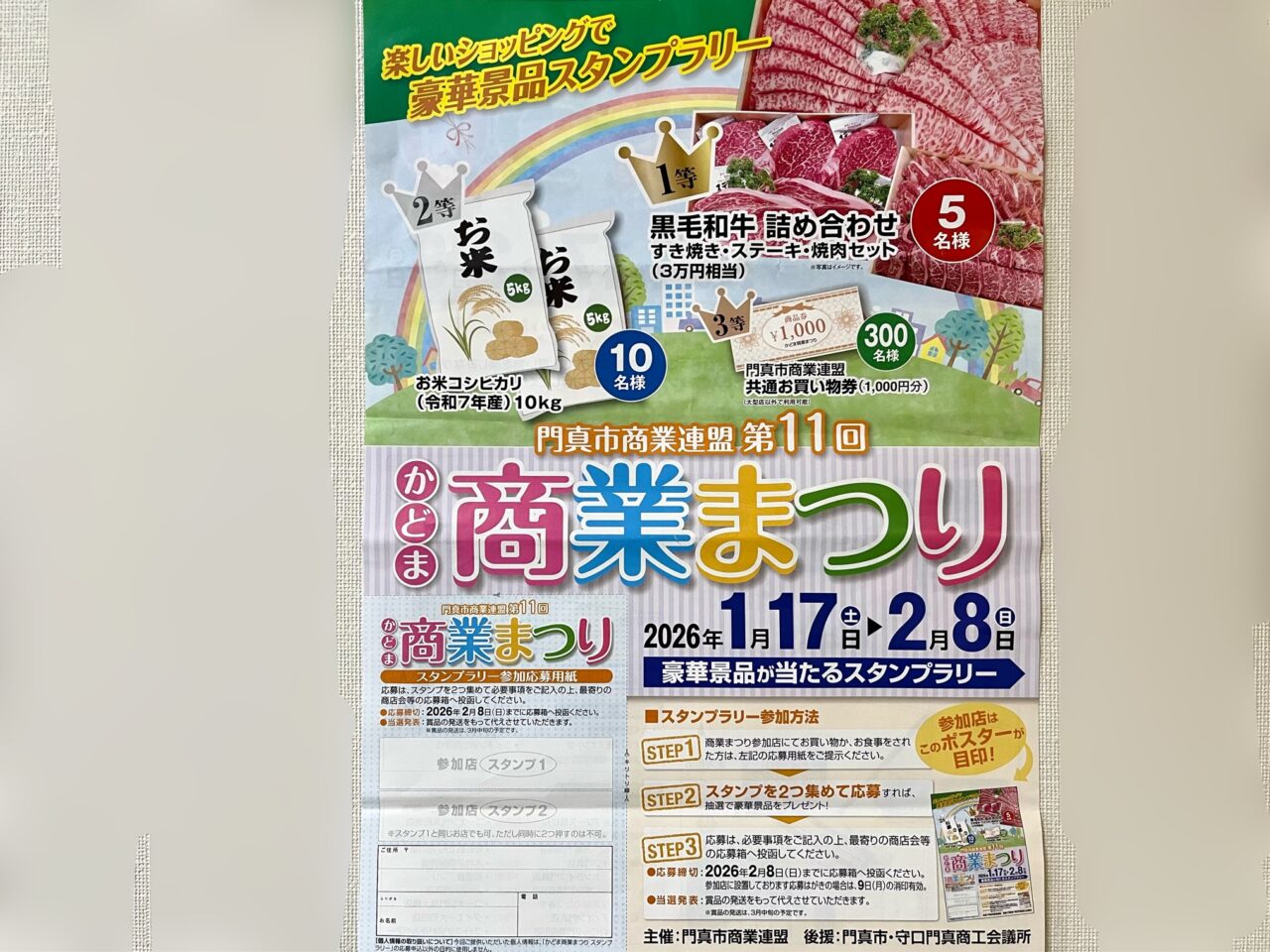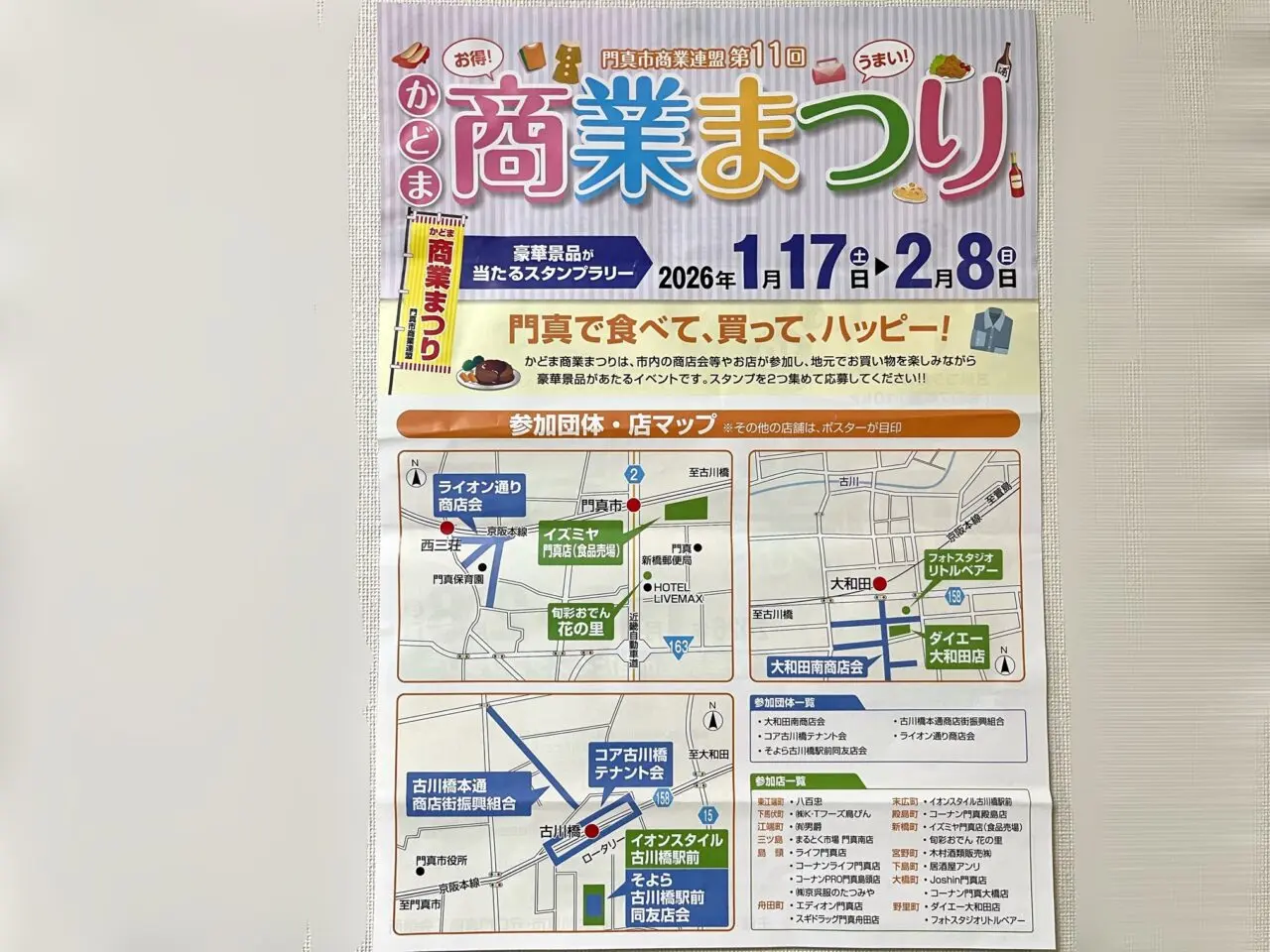 門真市商業連盟が主催する「第11回かどま商業まつり」が2026年1月17日(土)〜2月8日(日)まで開催されます。