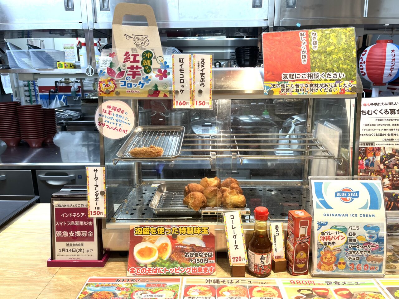 【守口市】イオンモール大日の「沖縄そば めんそーれ」で紅芋コロッケやサーターアンダギーをテイクアウト。沖縄フードが味わえるお店です。