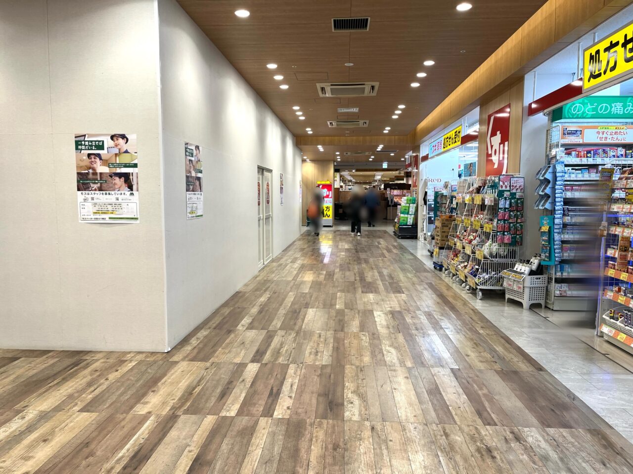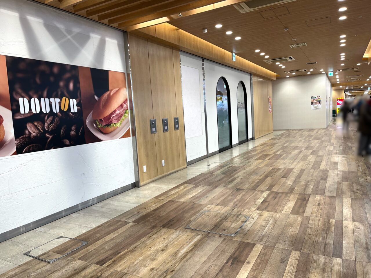 ドトールコーヒーの奥、これまで空きテナントとなっていた場所には白い囲いが設置されており、壁面に掲示物が貼られている様子が見られました。