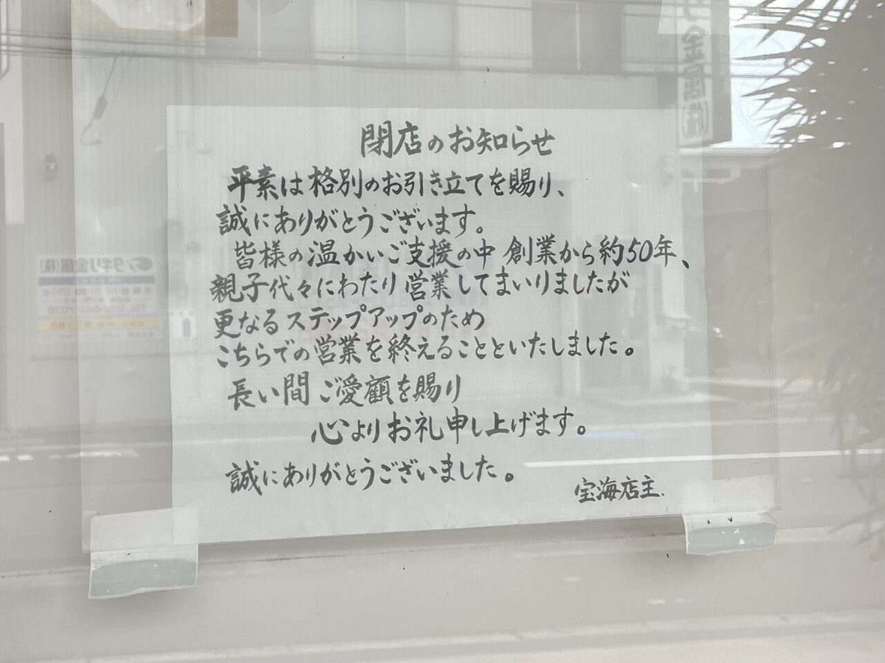 店頭には閉店のお知らせが掲示されていました。掲示によると、創業から約50年にわたり営業を続けてこられたとのことです。