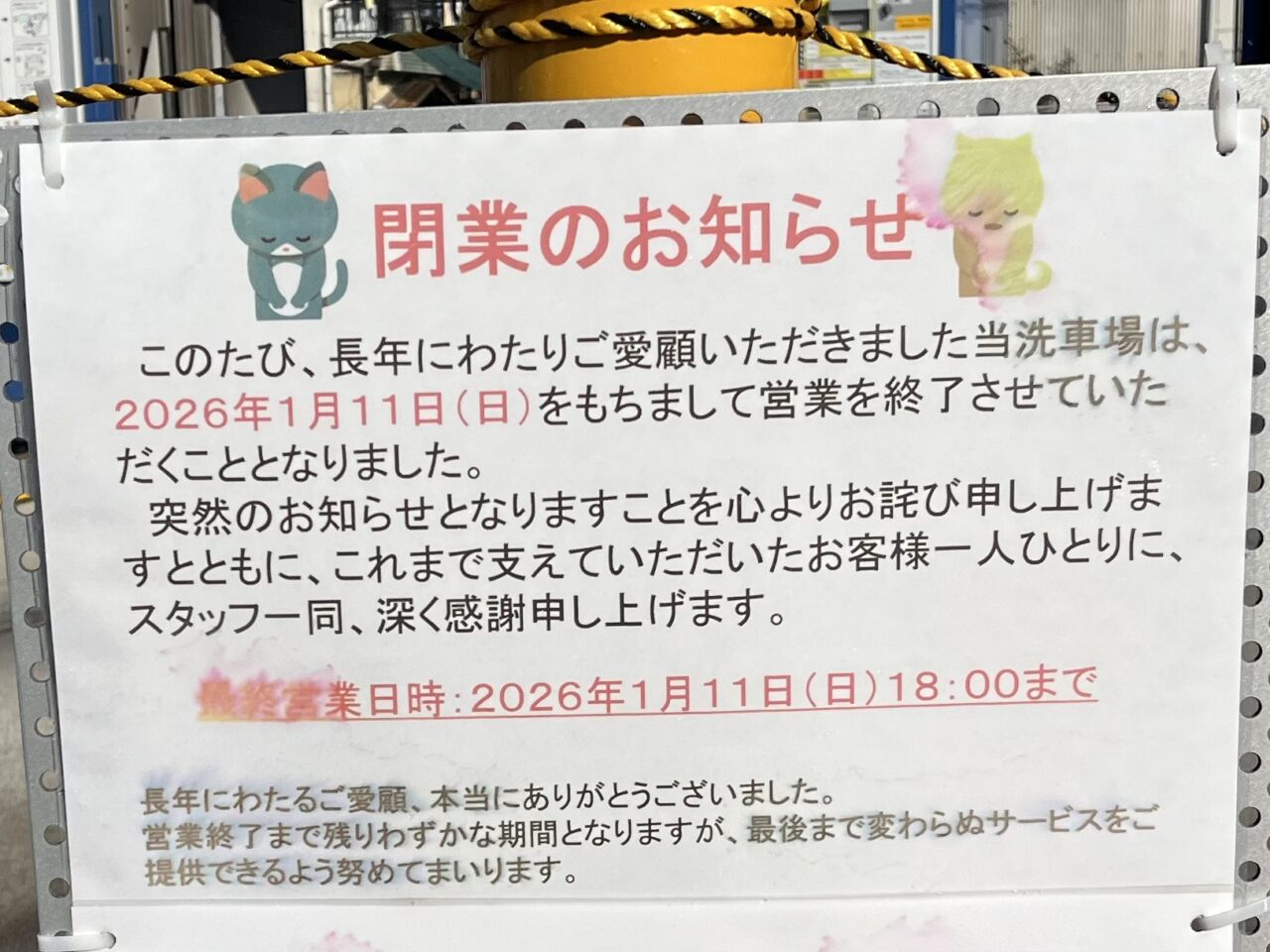 現地を訪れたところ、洗車機の前には進入を防ぐバーが設置され、「閉業」の掲示が出ている状態となっていました。また「閉業のお知らせ」と書かれた案内も掲示されており、感謝の言葉も添えられていました。公式Instagramでも閉業についての投稿が確認できました。