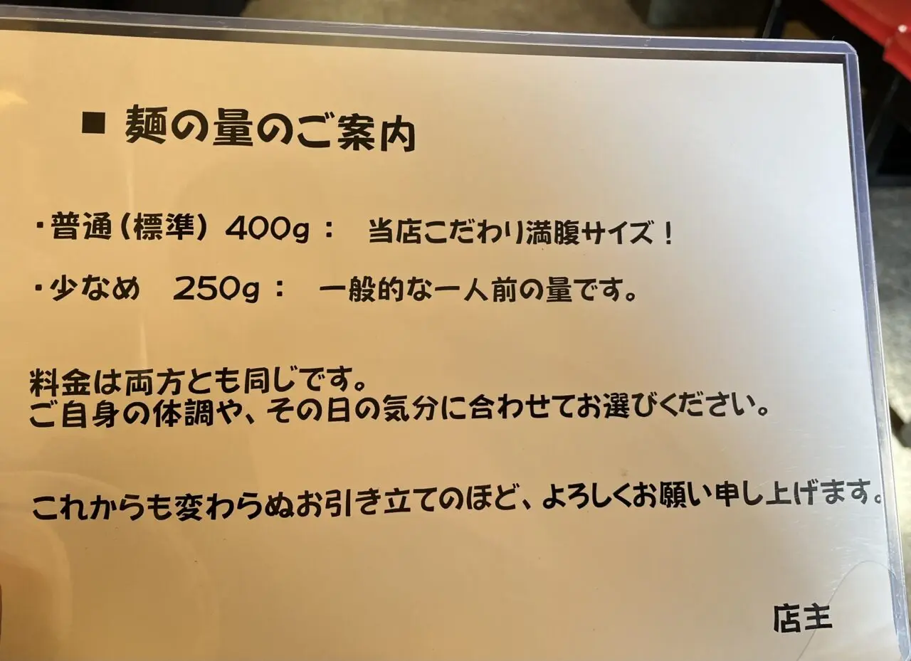 麺の量は「普通(標準)400g」が基本で、「少なめ(250g)」も選べるそうです。料金はどちらも同じとのことでした。