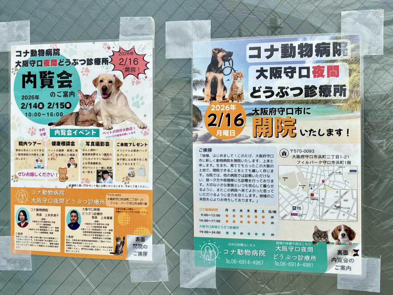 掲示されていたチラシには、日中の診療は「コナ動物病院」、夜間診療は「大阪守口夜間どうぶつ診療所」として案内されていました。2026年2月16日(月)に開院予定で、開院前には内覧会(2月14日・15日)も予定されているようです。