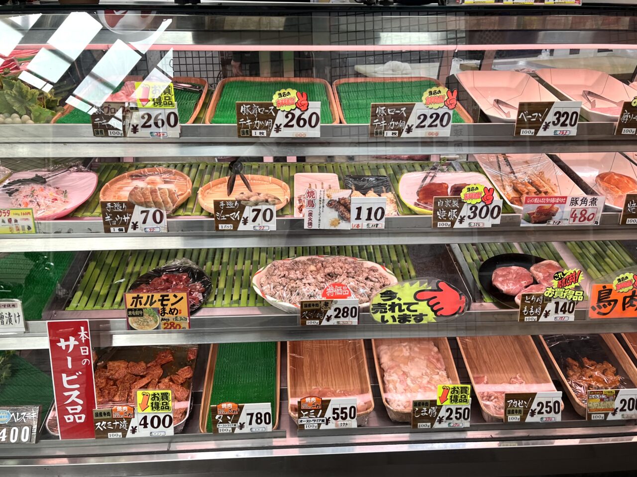 店頭の冷蔵ケースには、量り売りのお肉がずらりと並んでいました。
