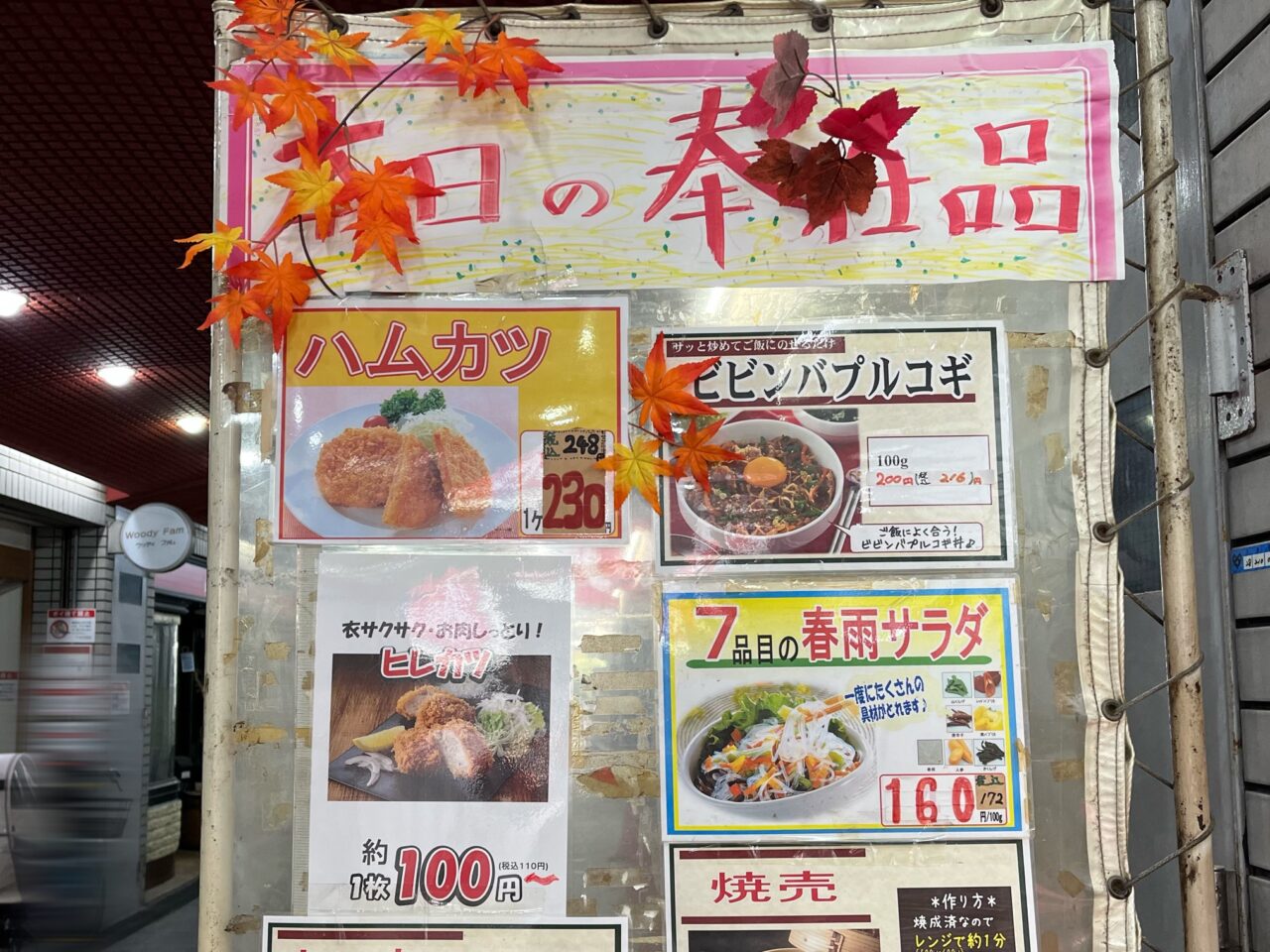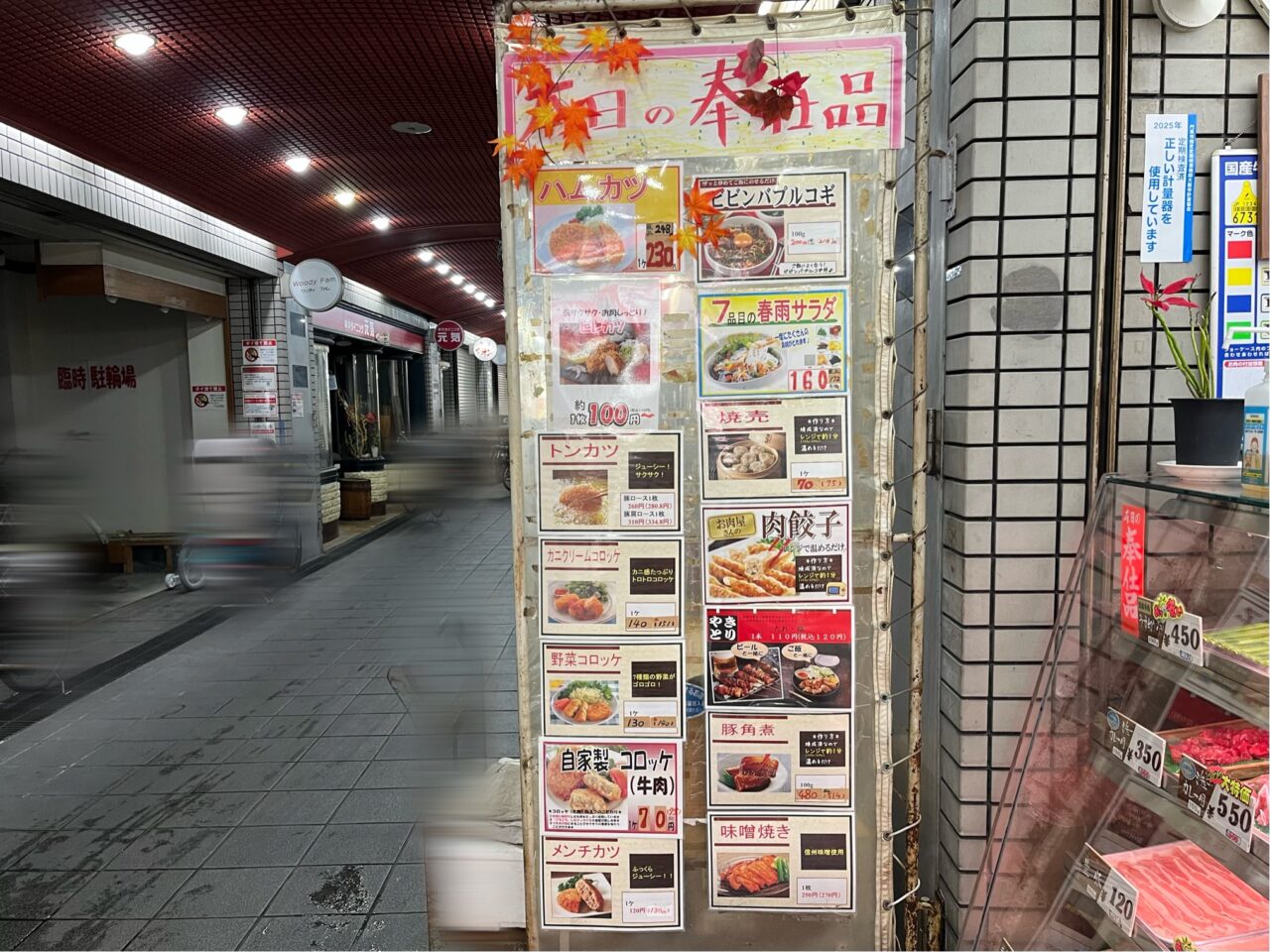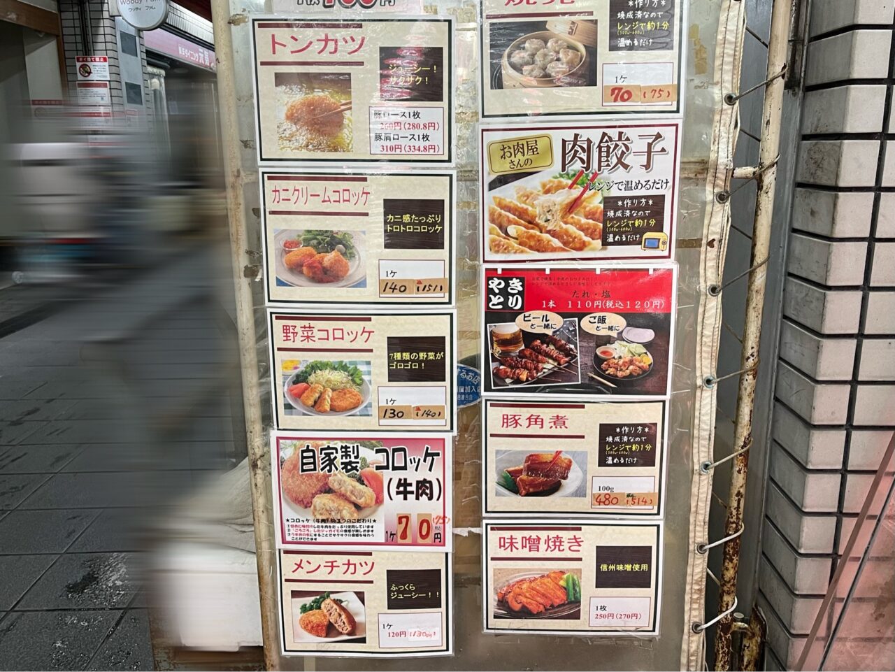 持ち帰りできる惣菜類のメニューの掲示があり、トンカツやコロッケ、焼き鳥などが並んでいました。