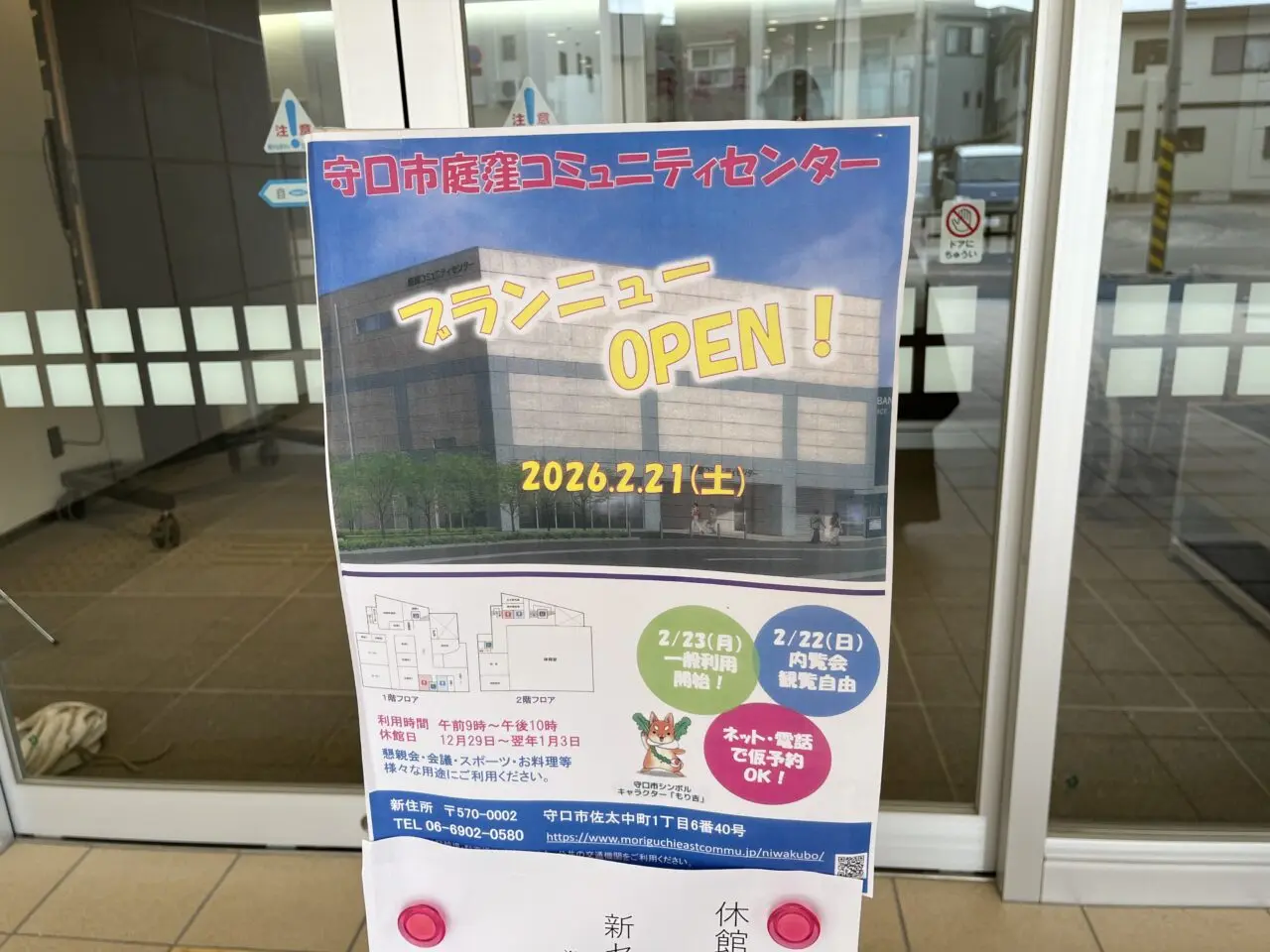 佐太中町にある「守口市庭窪コミュニティセンター」は、引っ越し・開館準備に伴い2026年2月1日(日)~2月22日(日)まで休館中となっています。案内によると、2月23日(月)から新しい庭窪コミュニティセンターの一般利用が始まる予定です。開館を前に現地を訪れると、準備が進んでいる様子でした。