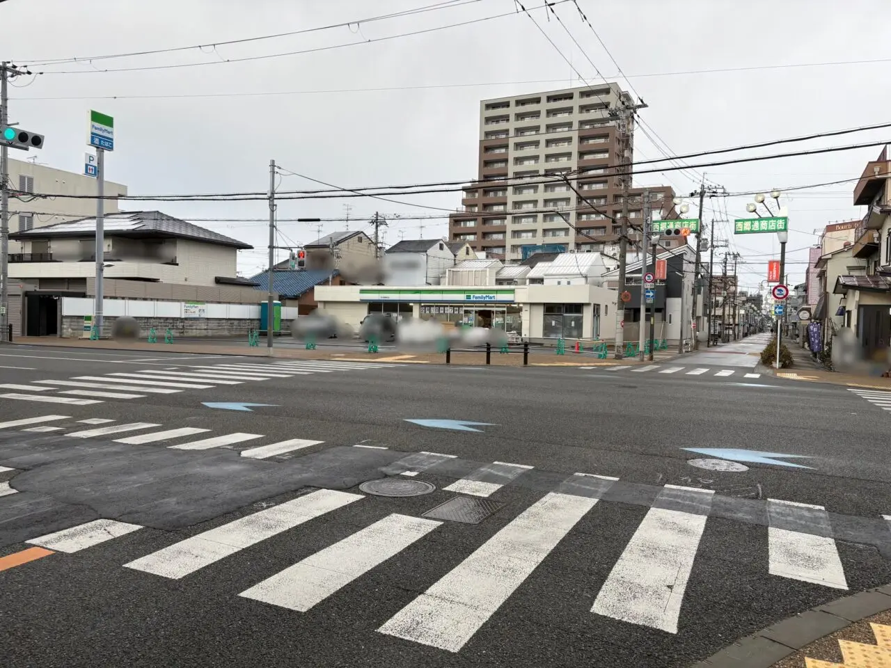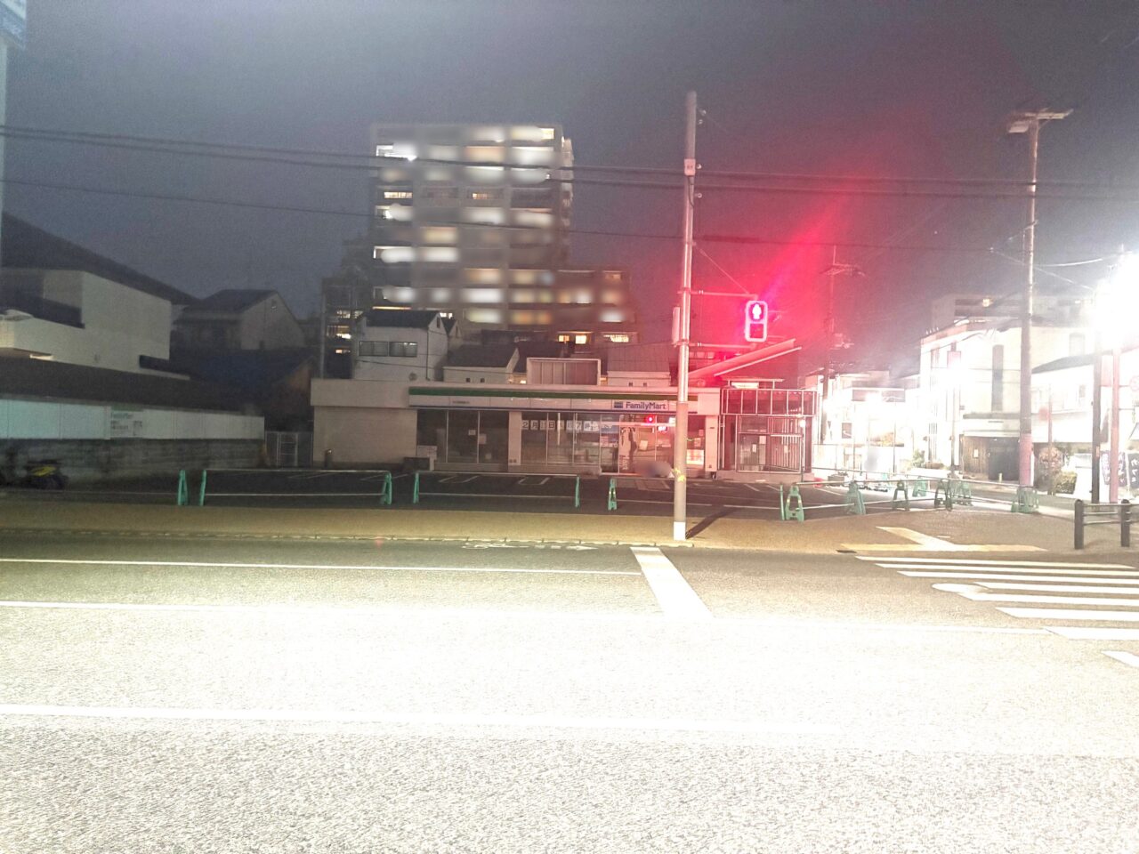 実際に現地を確認してきました。確認に訪れた時点では、建物正面のファミリーマートの看板が右側まで続いているように見え、外観が整えられている印象でした。