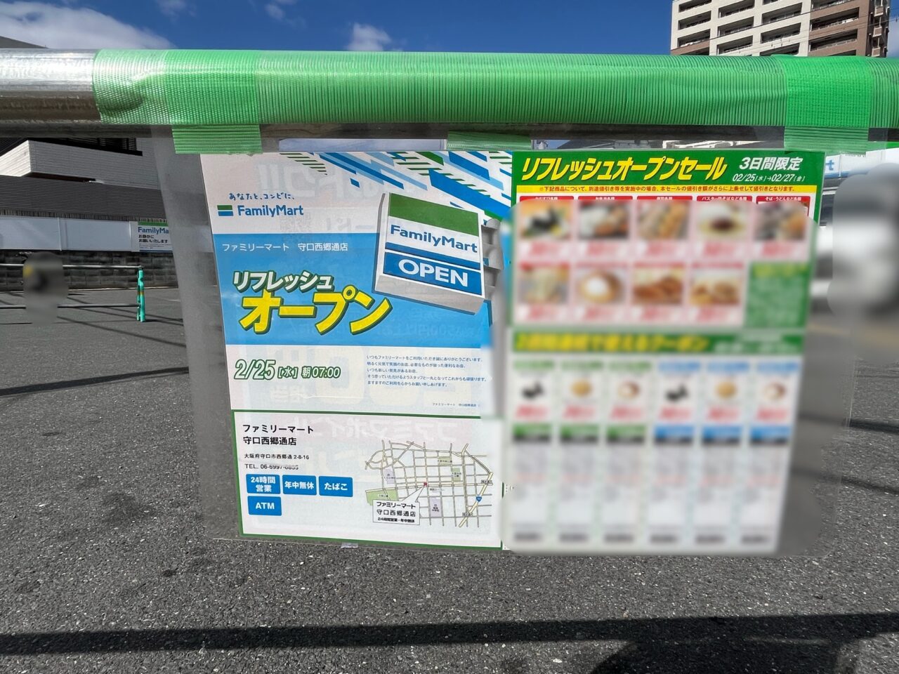 【守口市】「ファミリーマート守口西郷通店」が休業中。2月25日朝7時にリフレッシュオープン予定です