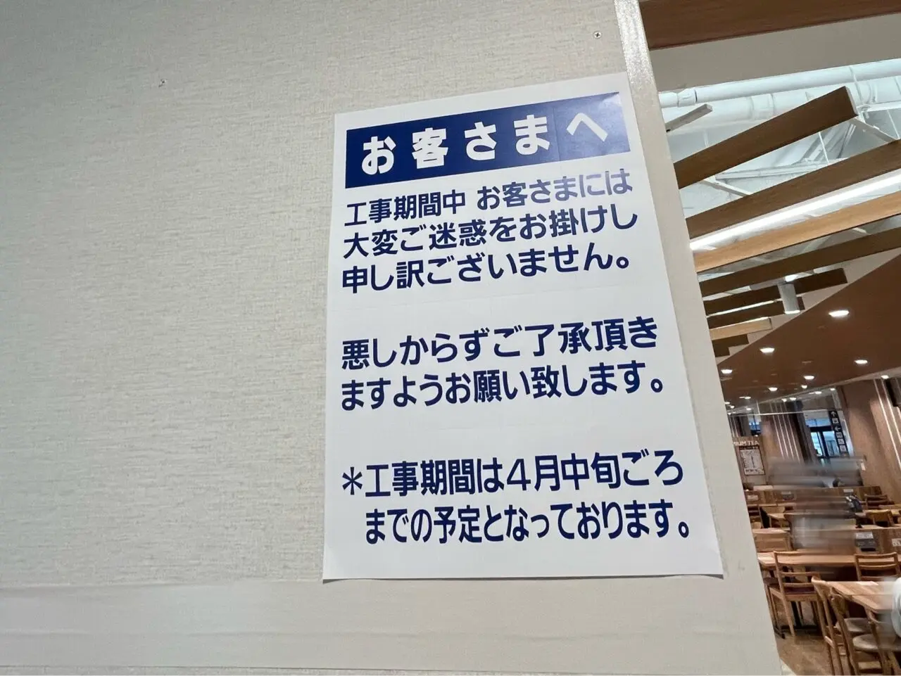 白い囲い(仮囲い)は、ラーメン店の隣の区画から設置されており、フードコート内でも比較的広い範囲にわたって続いていました。