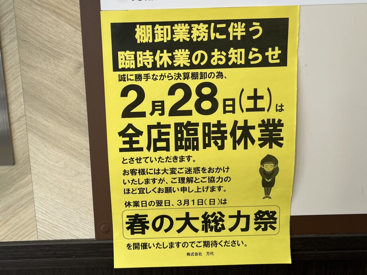 【守口市・門真市】スーパーマーケット「万代」が棚卸のため、2月28日は全店一斉休業となります。