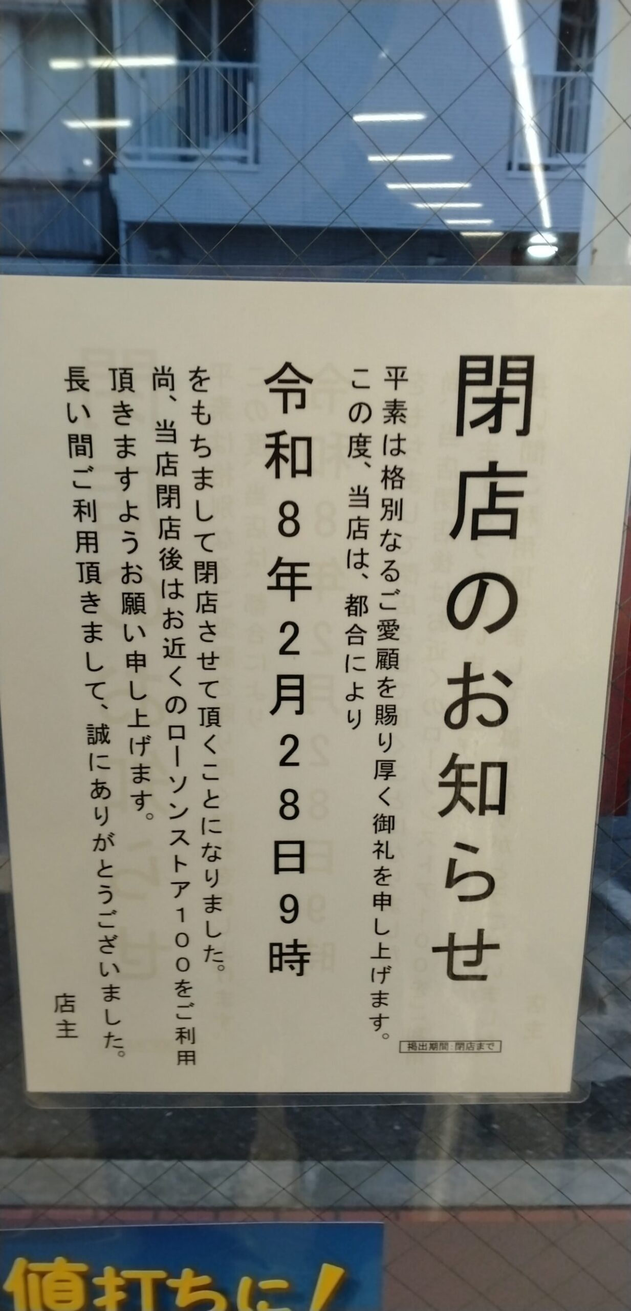 案内には、2026年2月28日(土)9時をもって閉店する旨が記載されていました。あわせて、これまでのご愛顧へのお礼と、閉店後は近隣店舗の利用をお願いする内容も見られました。