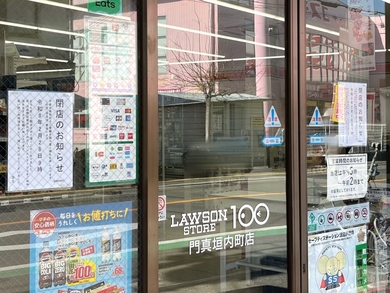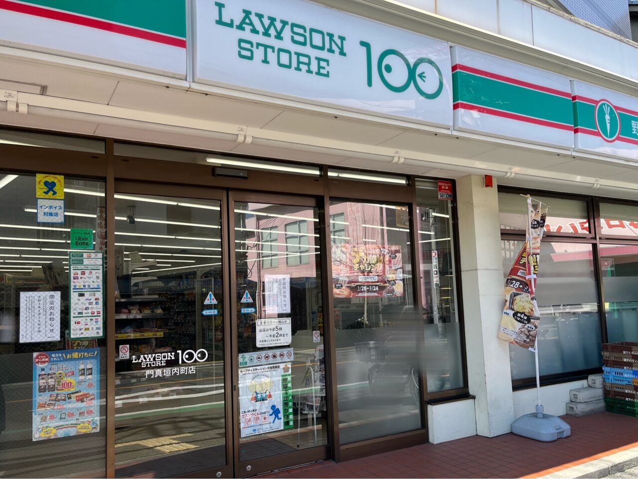 垣内町にある「ローソンストア100 門真垣内町店」は、店頭の案内によると、2026年2月28日(土)9時をもって閉店するとのことです。