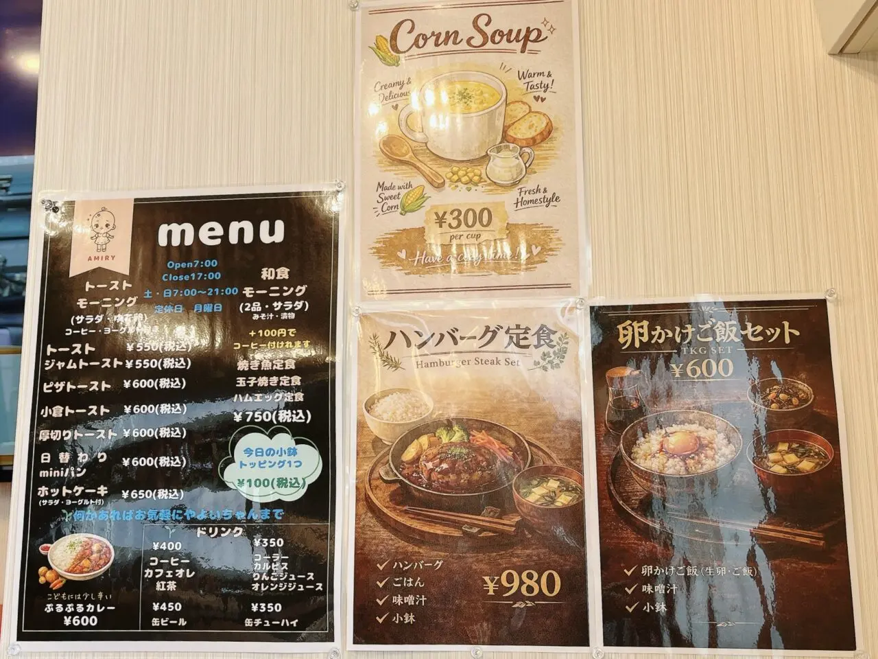 オープンしたことをお伝えした記事は、こちらです。なお、「ごはんや AMIRY」は、定食が人気のお店「たこ焼き・駄菓子 ぷるぷる」の姉妹店としてオープンしました。