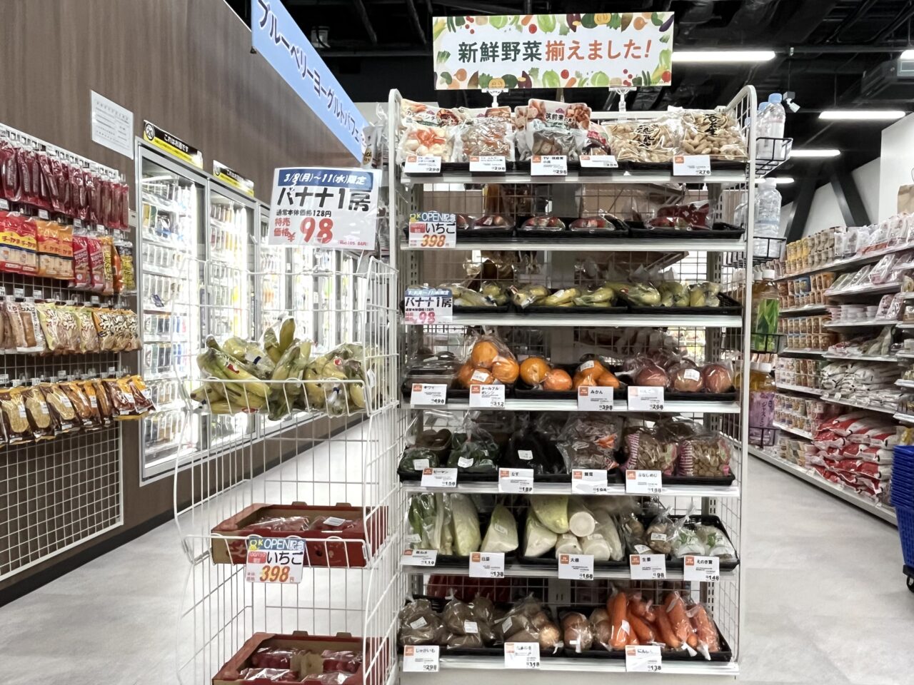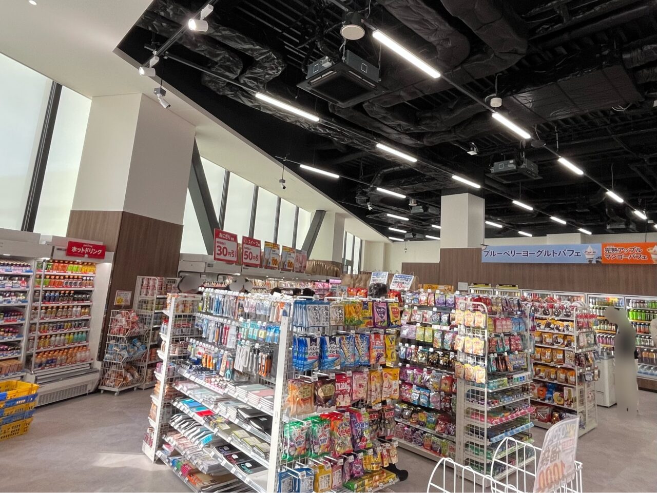 店内は広々としていて、新鮮野菜やお肉、冷凍食品なども揃っていました。ミニストップはイオングループのコンビニエンスストアで、グループのスーパーで取り扱われている商品も並び、コンビニの便利さにスーパーのような品揃えを取り入れた店舗となっています。イートインスペースも設けられていました。