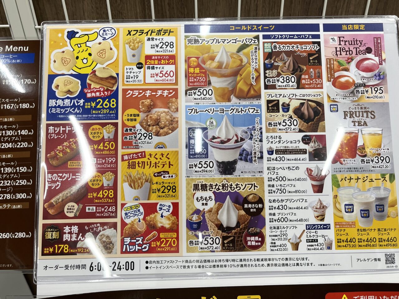 セルフレジには、フードやドリンク類のメニュー表が掲示されており、セルフレジでも選んで購入できるようになっていました。