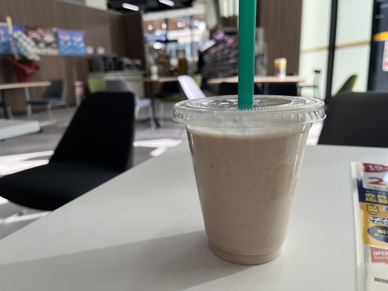 店舗限定のバナナジュースをイートインスペースでいただきました。なめらかさがありつつもすっきりと飲みやすい一杯でした。バナナジュースは2026年3月時点で全国6店舗で取り扱っているそうで、西三荘駅前店もそのひとつです。