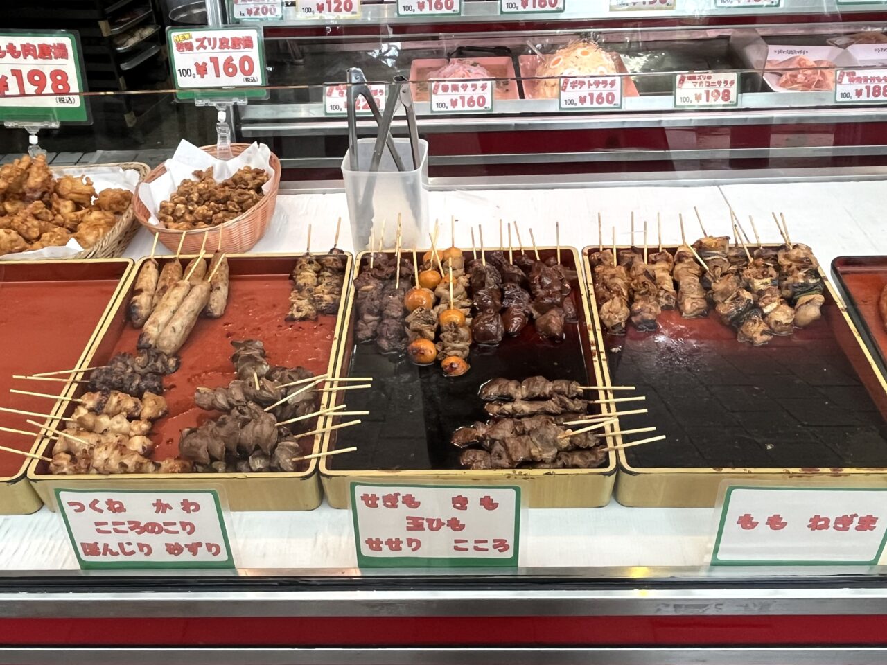 焼き鳥コーナーには、ももやねぎまの定番に、せぎも、せせりなど、鶏肉専門店ならではのメニューがそろっていました。