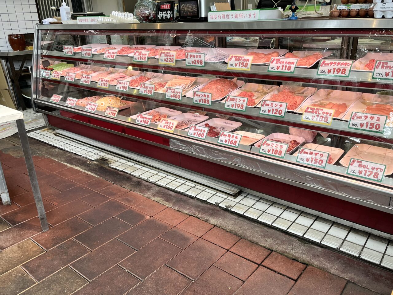 ショーケースには、新鮮な朝引き鶏やいろいろな種類の鶏肉のほか、ポテトサラダなどの総菜も並んでいます。