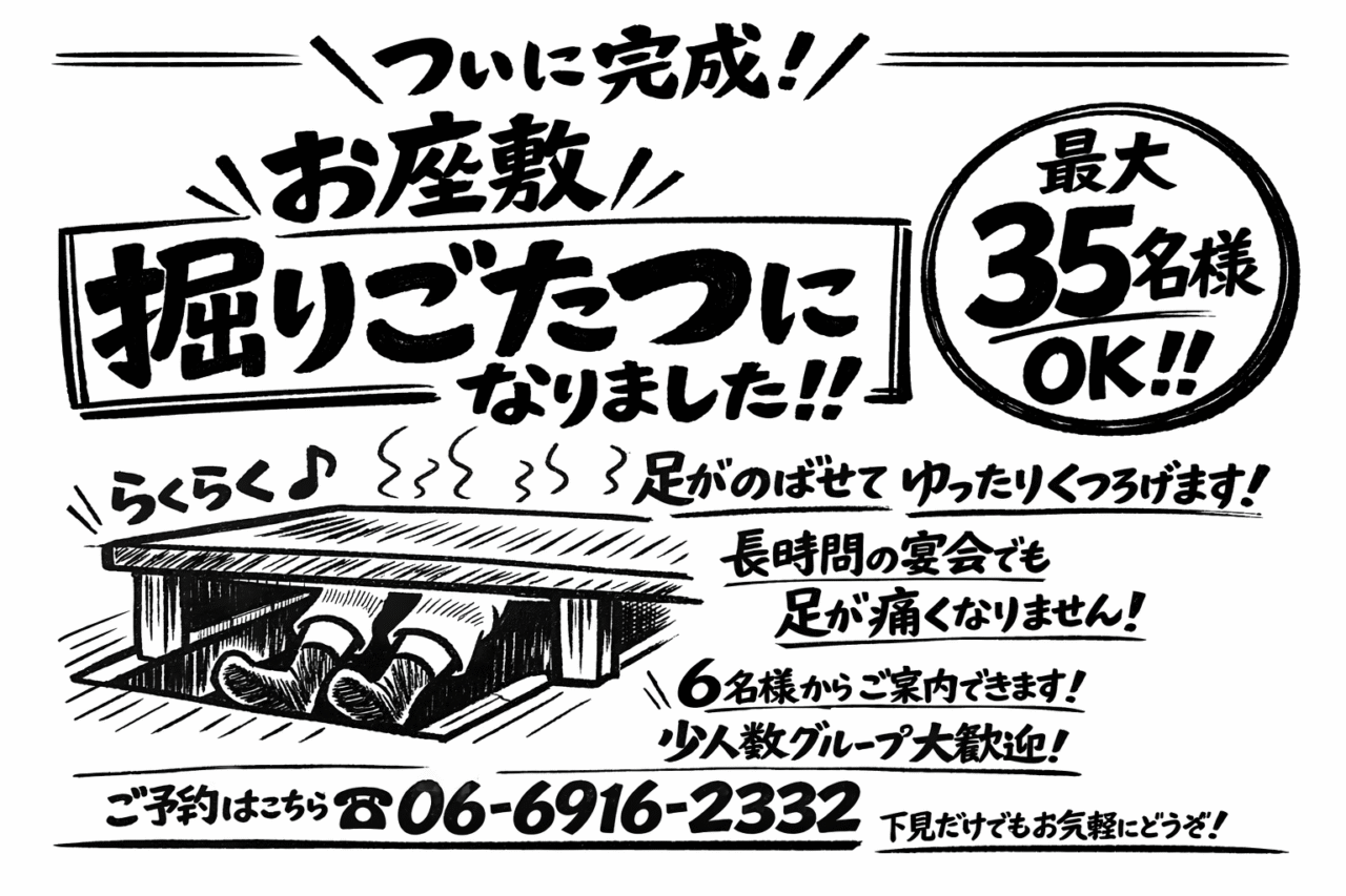 【門真市】西三荘駅近くの居酒屋「だんらん酒場 明日もげんき」では、座敷席が掘りごたつ席にリニューアルされています。