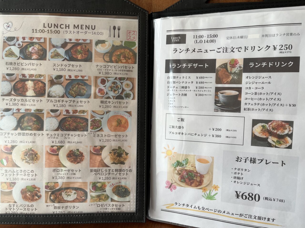 ランチメニューは種類豊富で、イタリアンから韓国料理まで幅広くそろっています。お子さまプレートもあり、家族やグループで訪れてもそれぞれ好みに合わせて選びやすそうでした。(メニューは取材時点の内容です。)