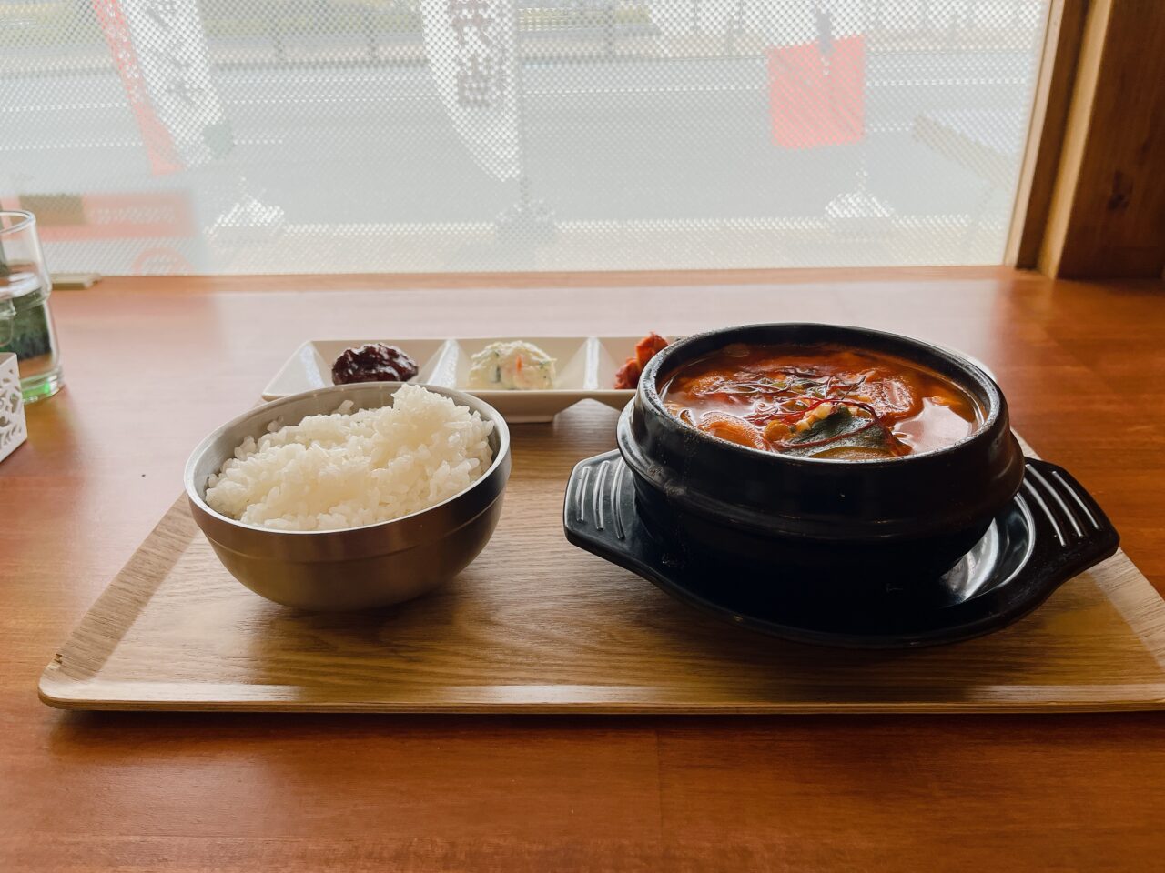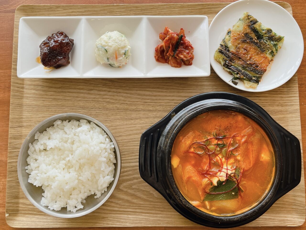 今回は、スンドゥブセットを注文しました。チヂミに加え、この日はヤンニョムチキン、ポテトサラダ、キムチの3種の副菜が付いていました。お店の方によると、副菜3種の内容は日によって異なるそうで、キムチはいつも付くとのことでした。