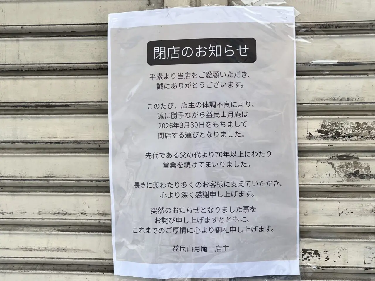 【門真市】大和田駅近くの和菓子店「益民山月庵」が閉店していました。店頭にはお知らせも掲示されていました