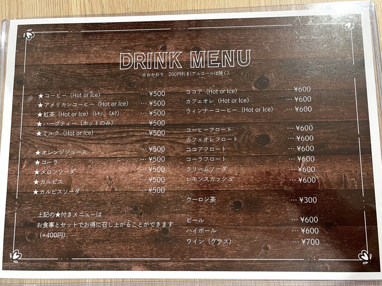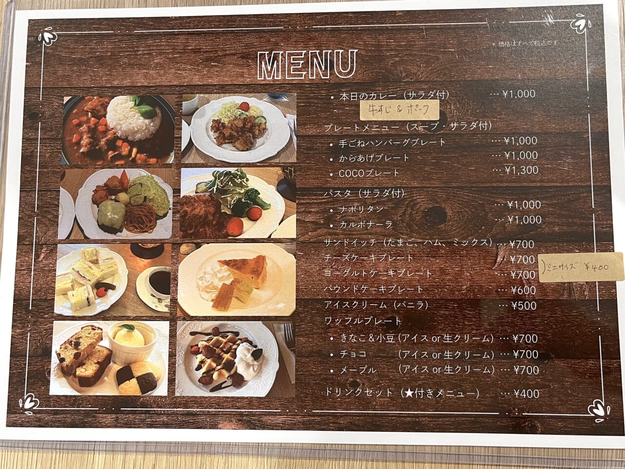 メニューには、プレートやパスタ、カレーなどの食事系のほか、デザートもありました。お店の方のお話では、料理やデザートは手作りで用意されているそうです。