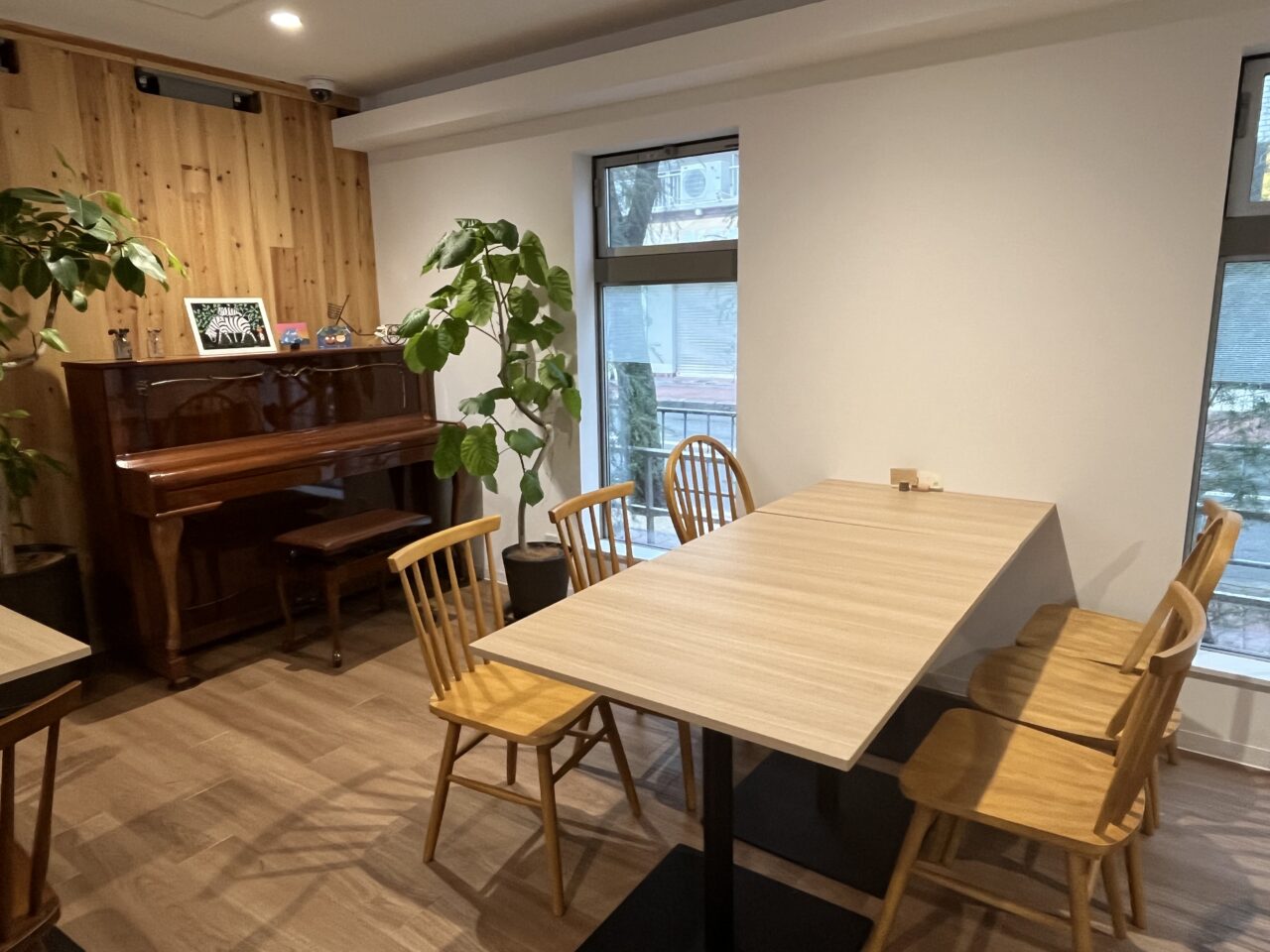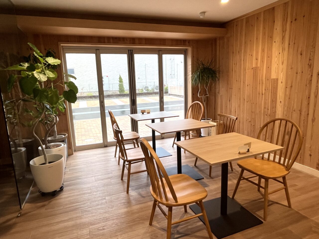 店内に入ると、木目の壁や家具、観葉植物が調和した、やさしい雰囲気の空間が広がっていました。