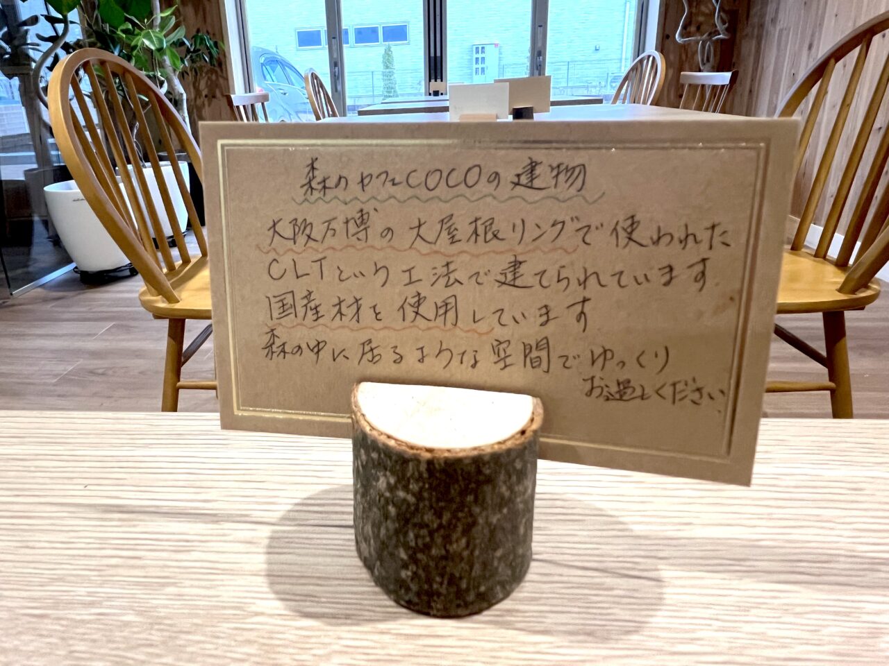 卓上には、建物が「大阪・関西万博の大屋根リングでも使われたCLT工法で建てられている」ことや、国産材を使用していることなどが案内されていました。