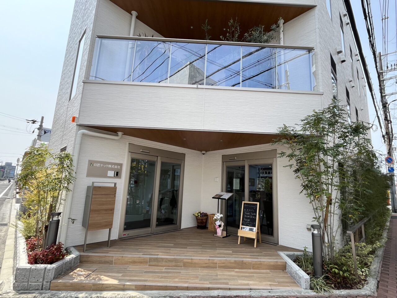 お店は古川橋駅から徒歩圏内の場所にあります。写真左側が、お店のある日匠テック株式会社の建物です。
