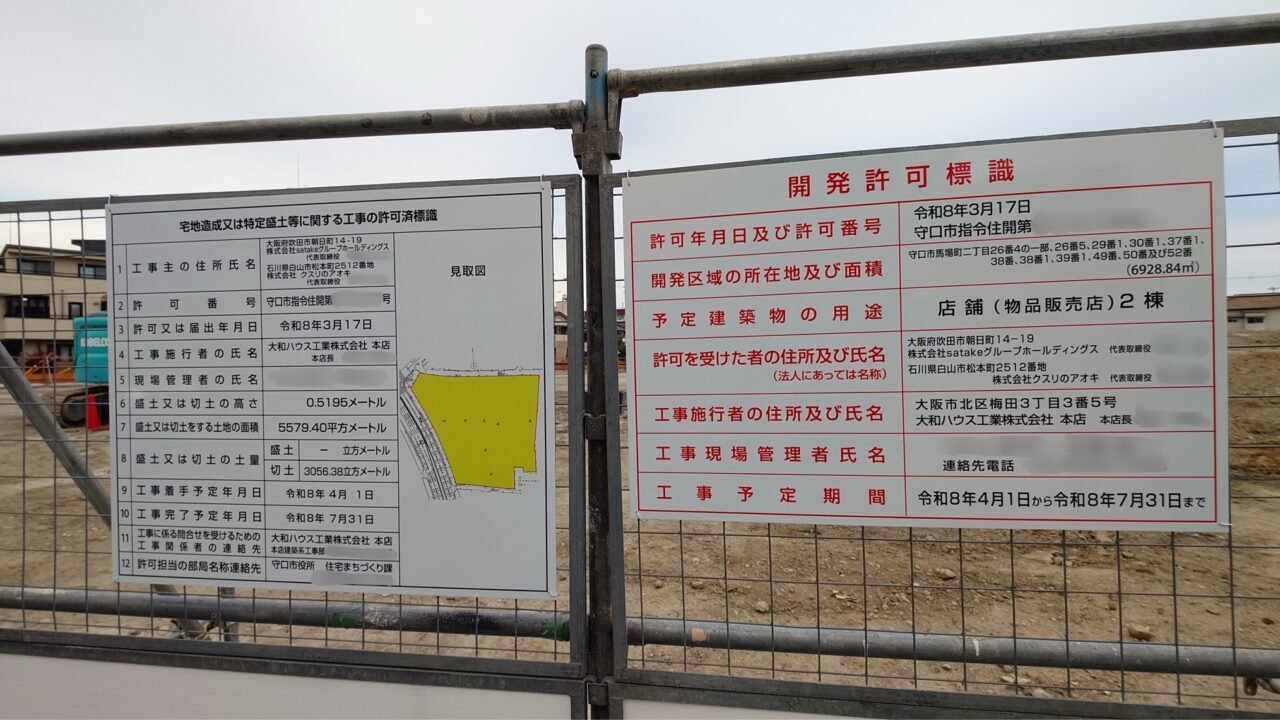 現地では複数の看板が確認でき、「開発許可標識」には「予定建築物の用途」として「店舗(物品販売店)2棟」と記載されていました。掲示には、「株式会社satakeグループホールディングス」と「株式会社クスリのアオキ」の名称が見られました。