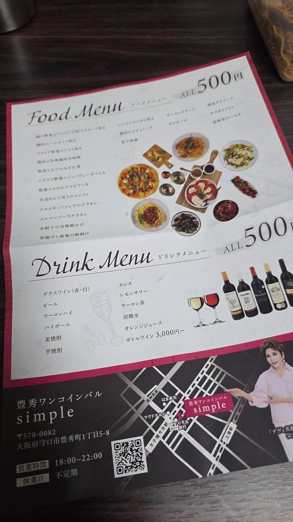 【守口市】豊秀町に「豊秀ワンコインバル simple」がオープンしているようです。ドリンク・フードALL500円と案内されていました。