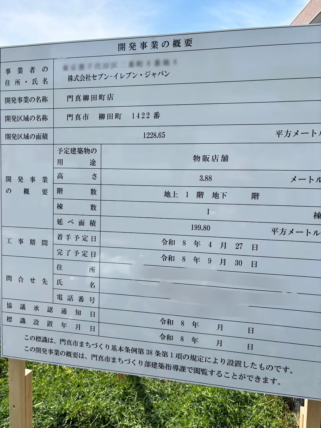 看板には、「事業者の住所・氏名」欄に『株式会社セブン‐イレブン・ジャパン』、「開発事業の名称」欄に『門真柳田町店』、予定建築物の用途は「物販店舗」と記載がありました。